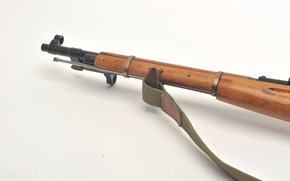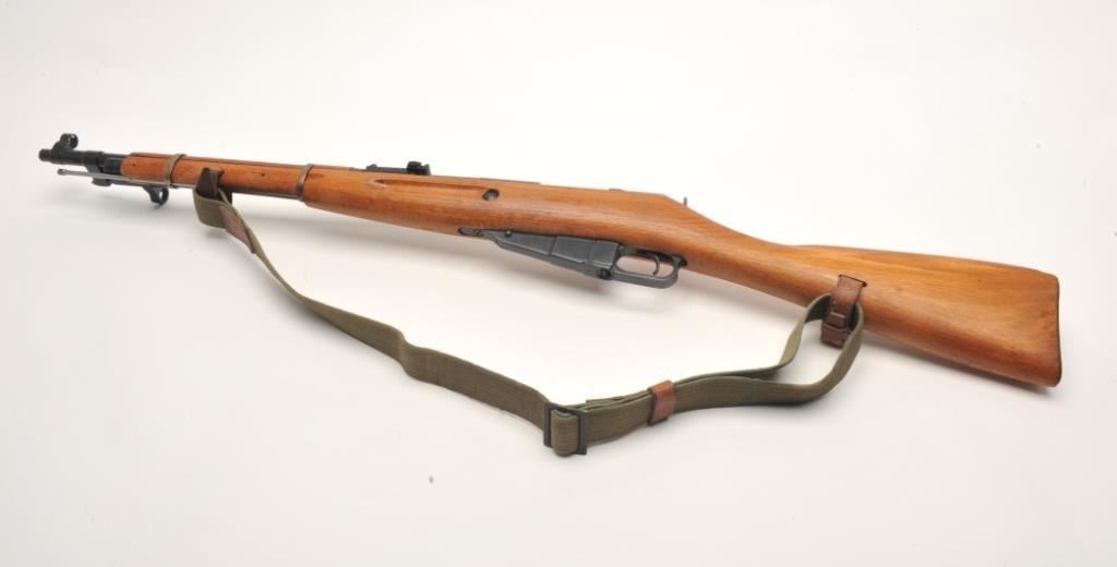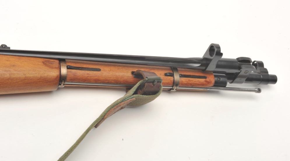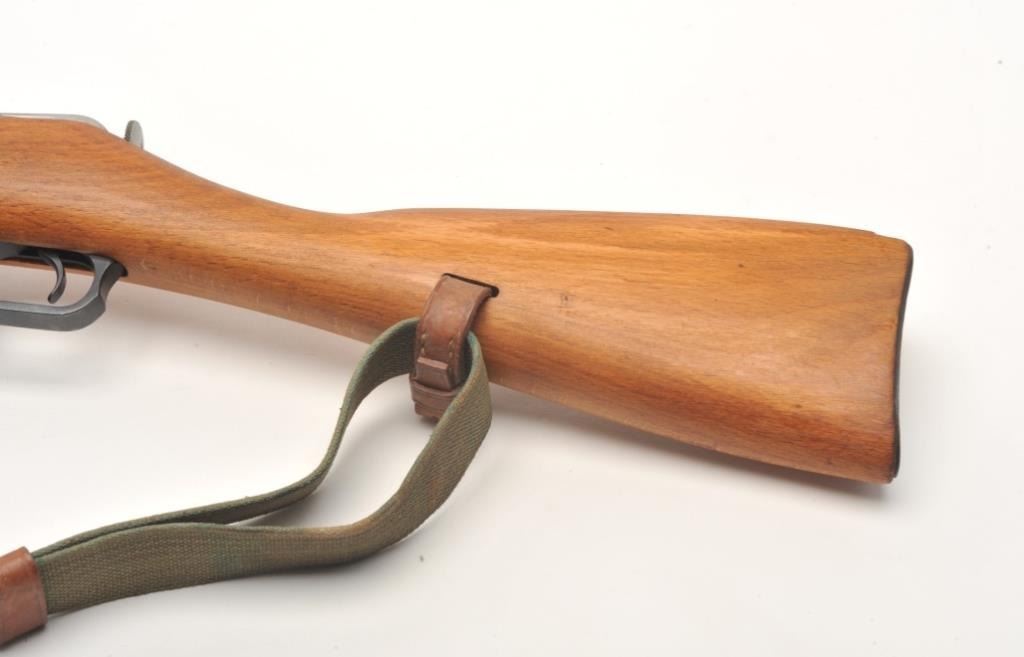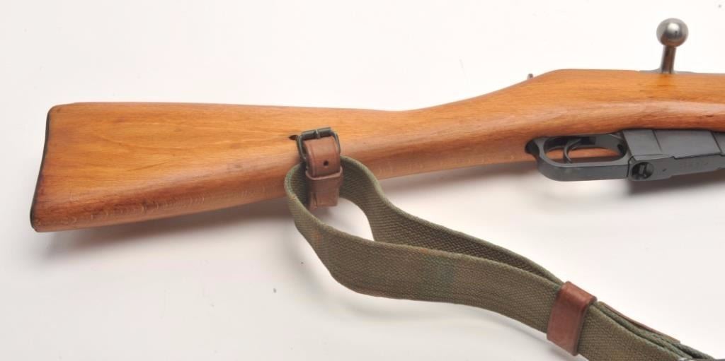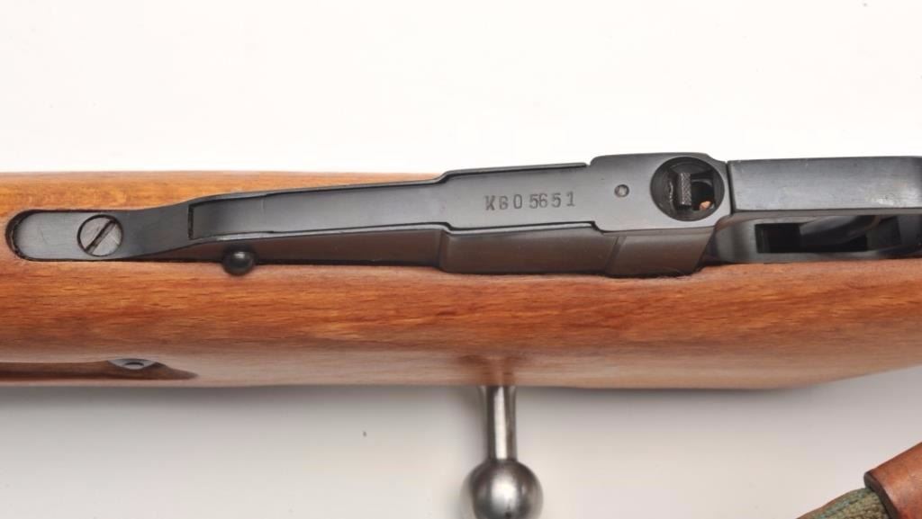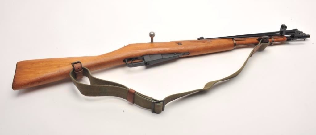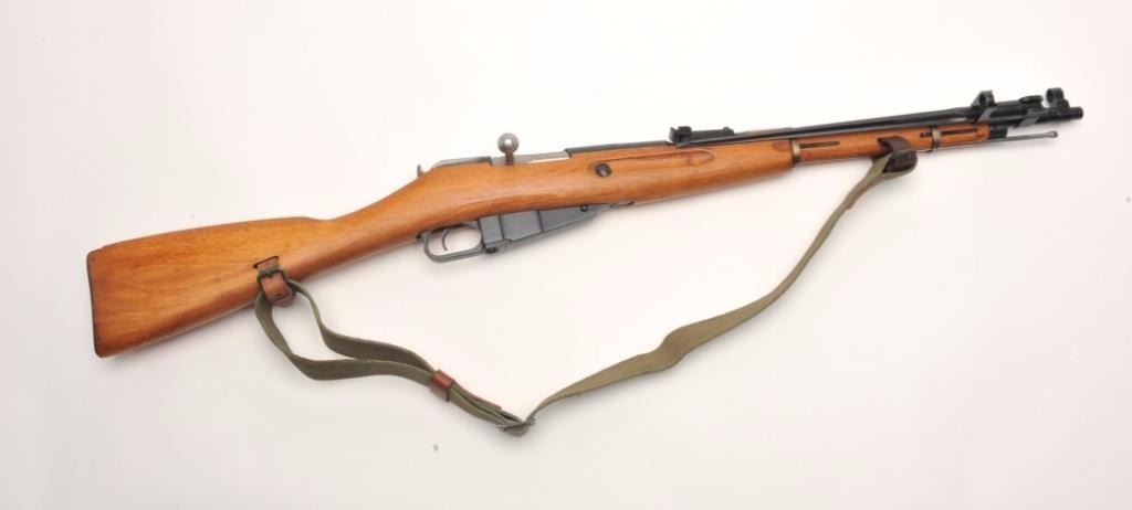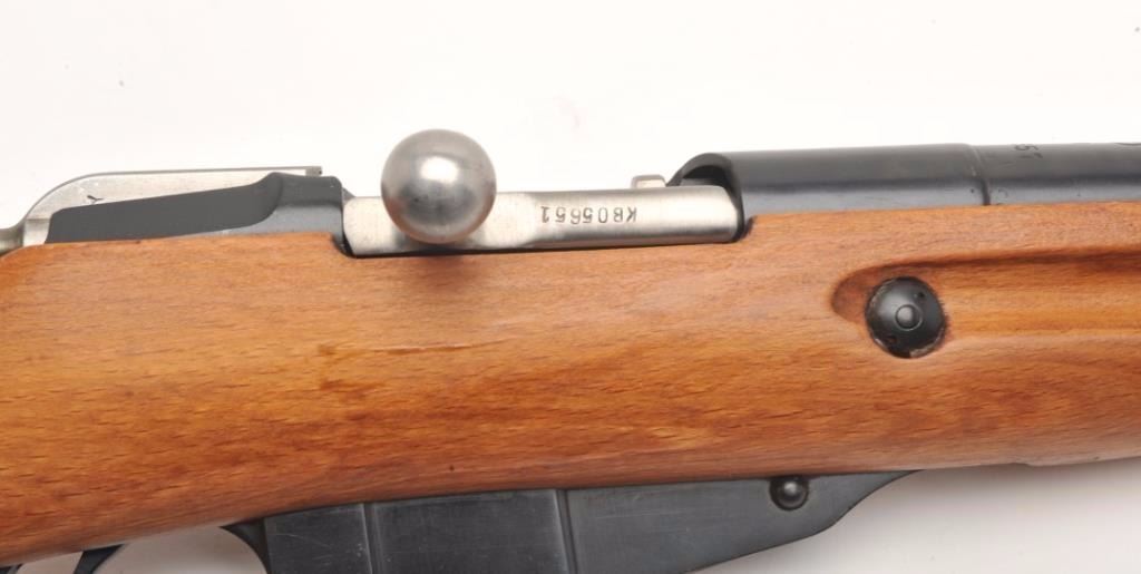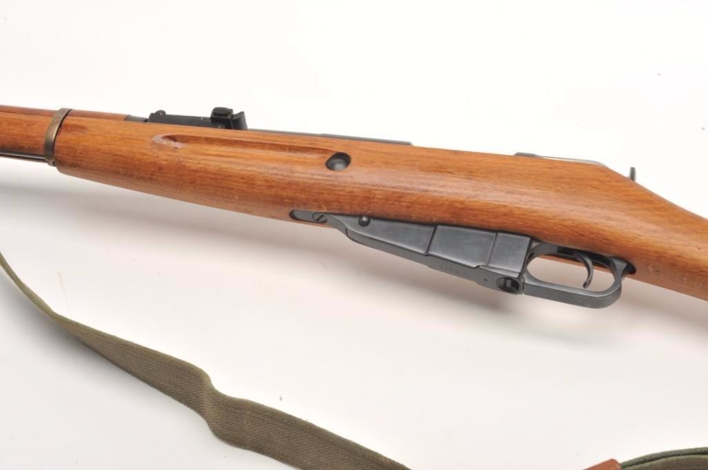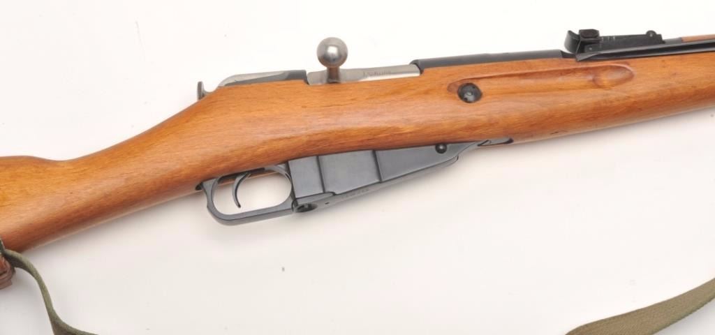 Mosin Nagant Model 44 bolt action carbine with attached folding bayonet, dated 1953, 7.62mm caliber, 21” barrel, black finish, wood stock with woven sling, S/N KB05651 (matching visible numbers). This gun is inoverall very good to near fine condition with a crisp action, sharp markings, very good to fine bore and wood stock. (C&R/PPT). Est.: $200-$400.