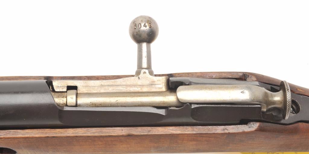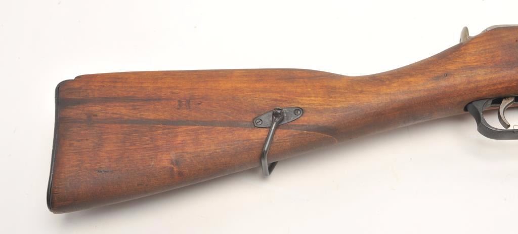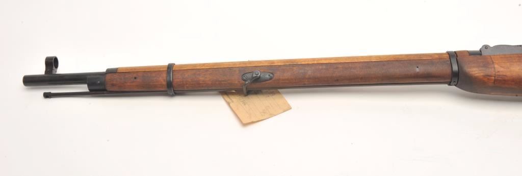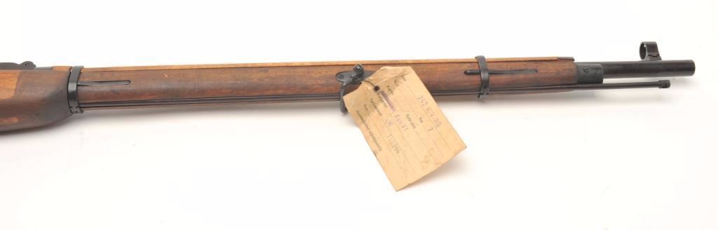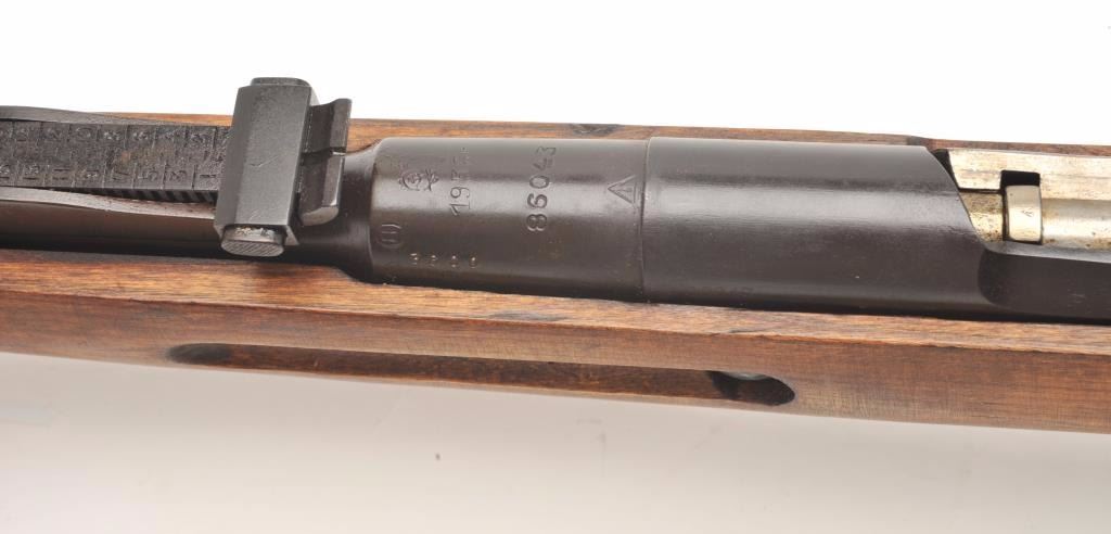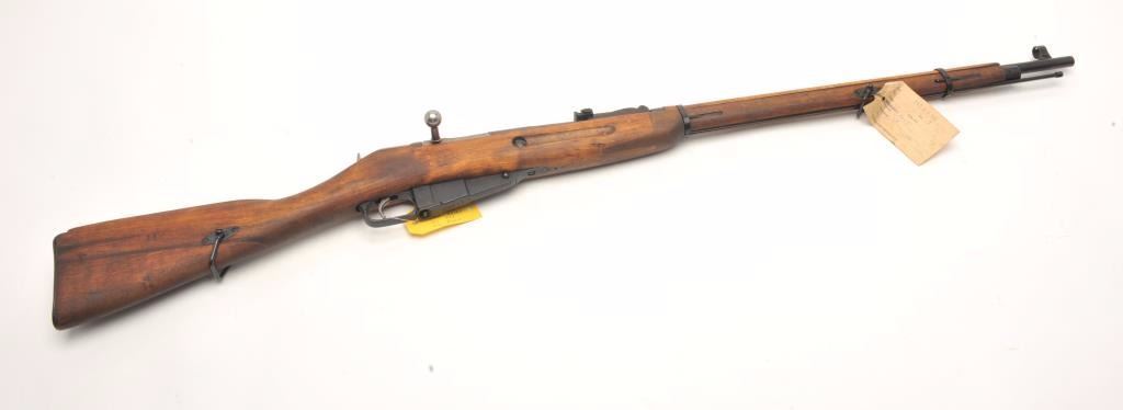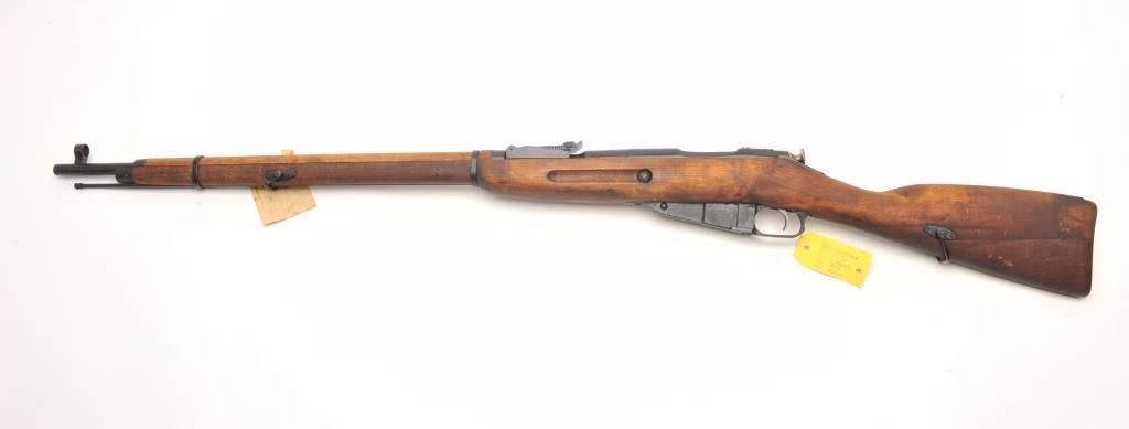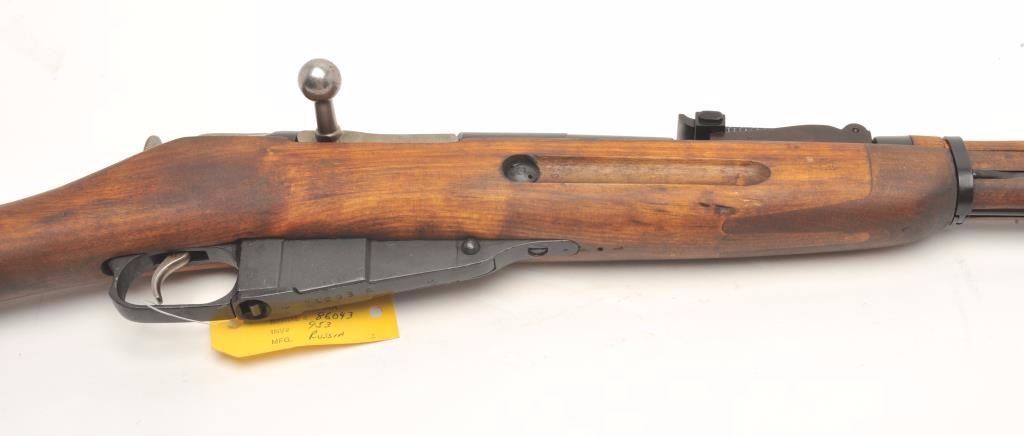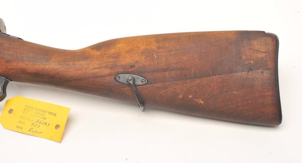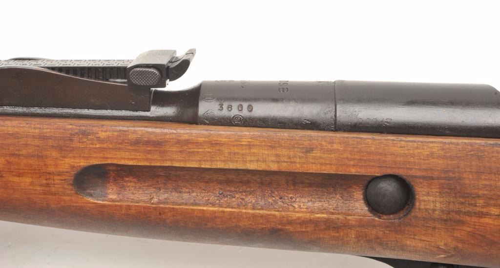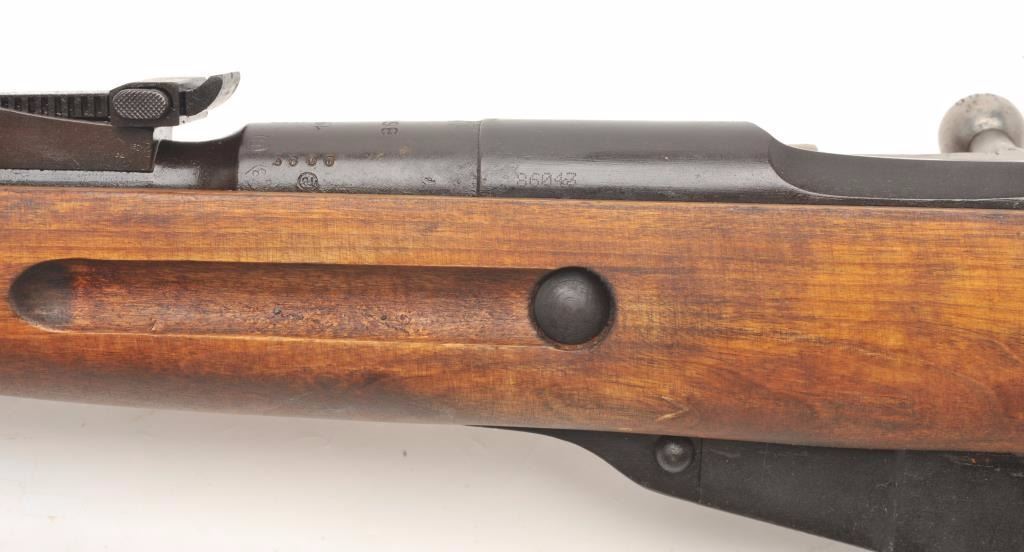 Mosin Nagant Model 91/30 bolt action rifle, 7.62 x 54R caliber, serial #86043. The rifle is in very good condition with a 29” barrel with a hooded front and military tangent style rear sights. The barrel and receiverretain nearly all of their military finish with only storage marks noted. The front ring features several Russian proofs and is dated 1936. The smooth wood stock is in good condition with storage marks, sling swivelsand a cartouche on the right side of the butt stock. The bore is good, action crisp and markings sharp on this pre-World War II battle rifle. (C+R) Est.: $200-$400.