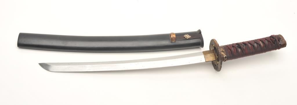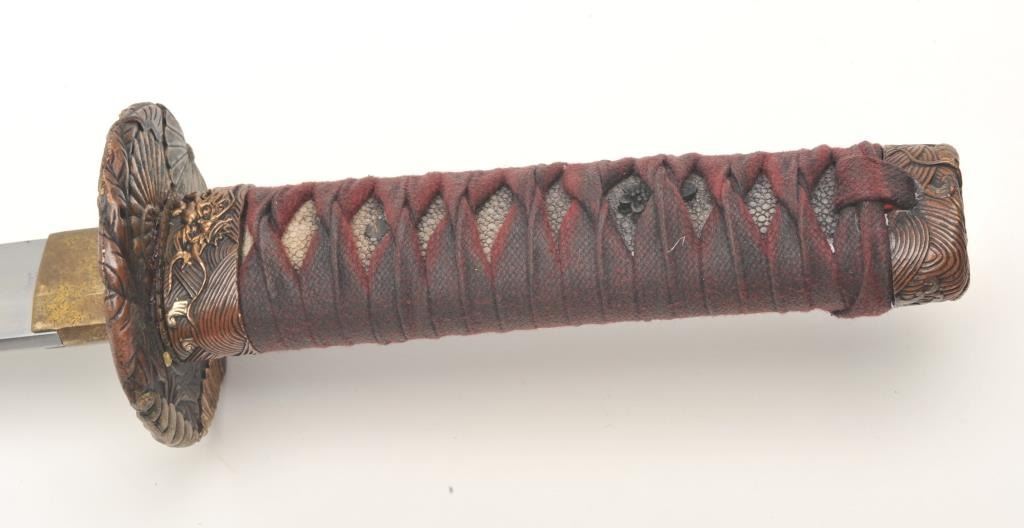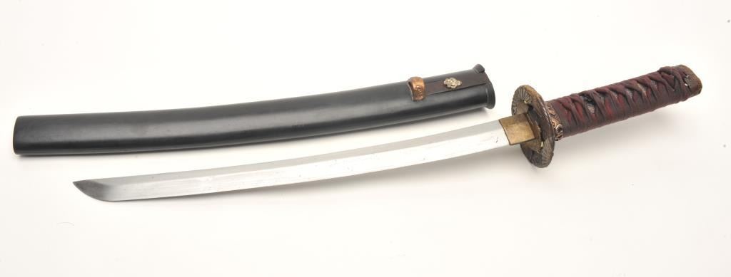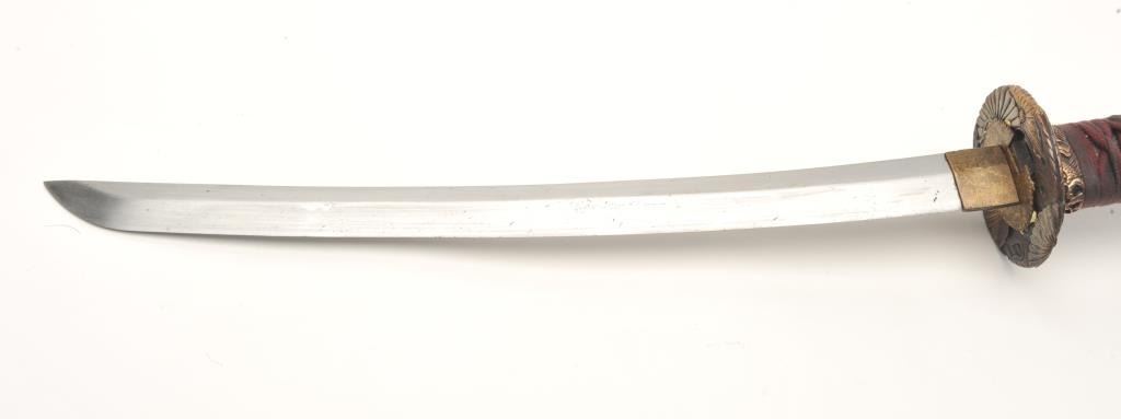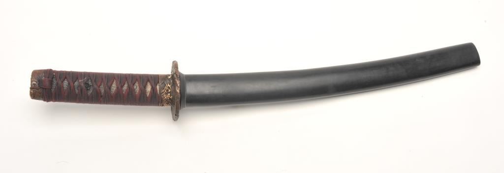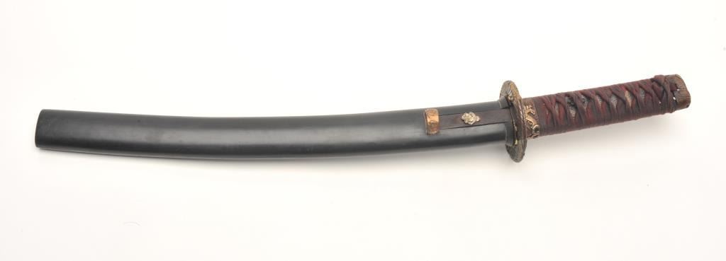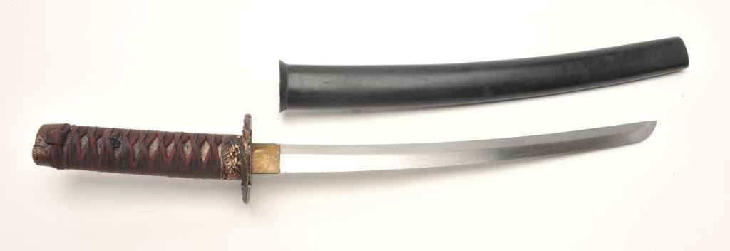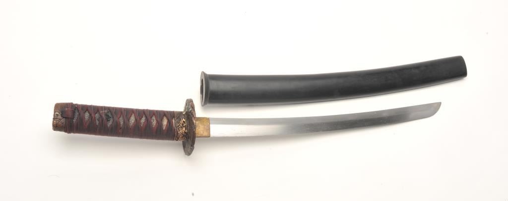 Contemporary made wakasashi in Japanese style of good quality but a reproduction. Considerably better and more accurate than most. The blade measures 14” and 21 ½” overall. Some attempts at aging. Looked gooduntil closely examined. The soft metal mounts are particularly good. Est.: $150-$300