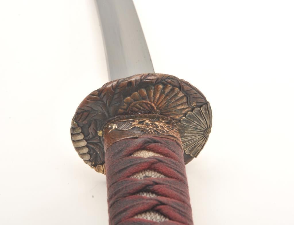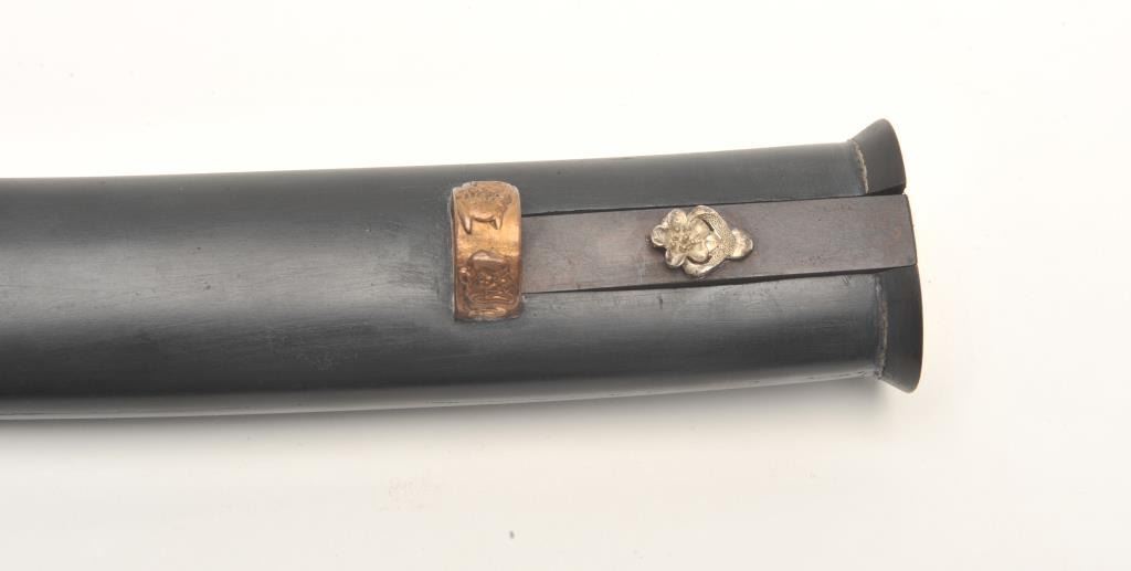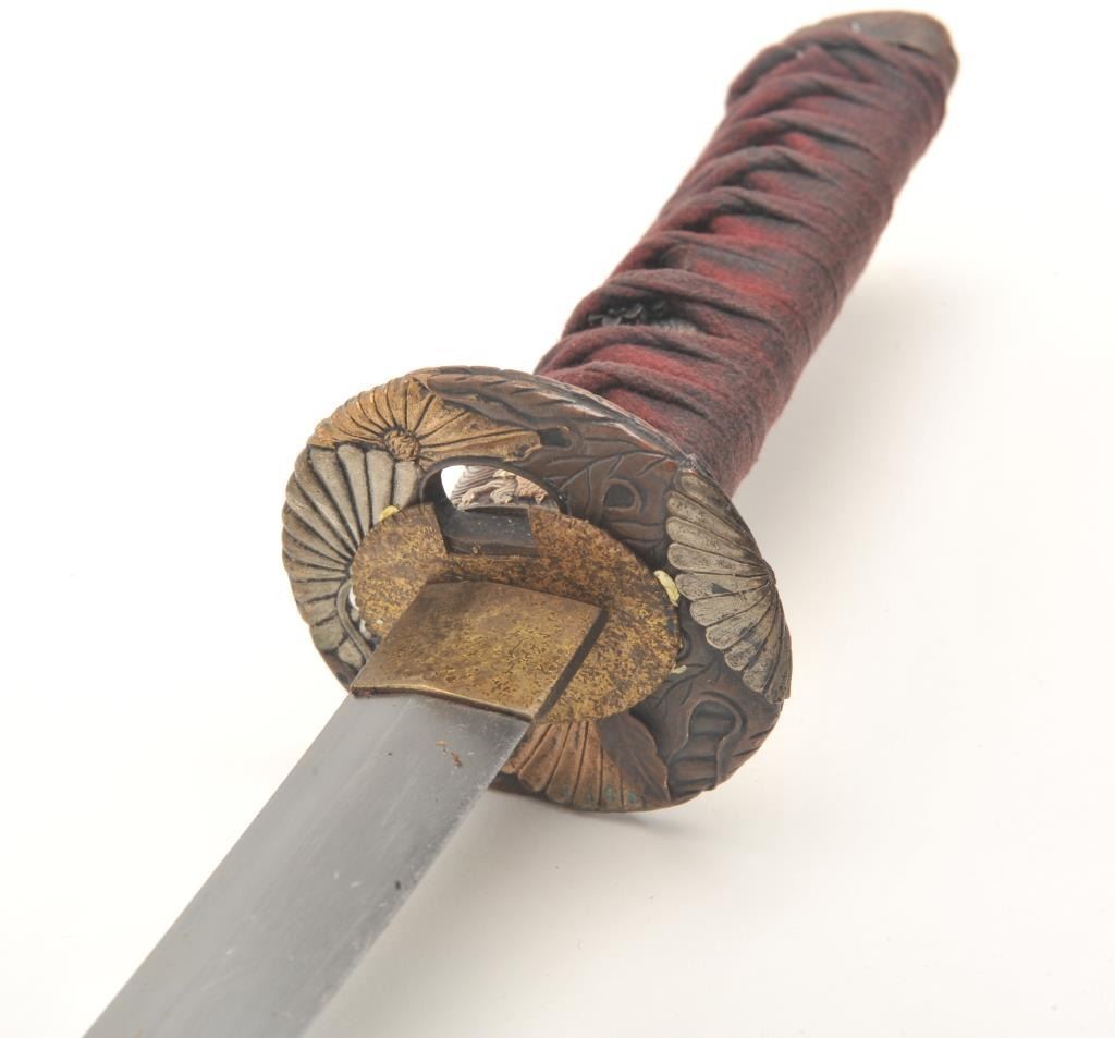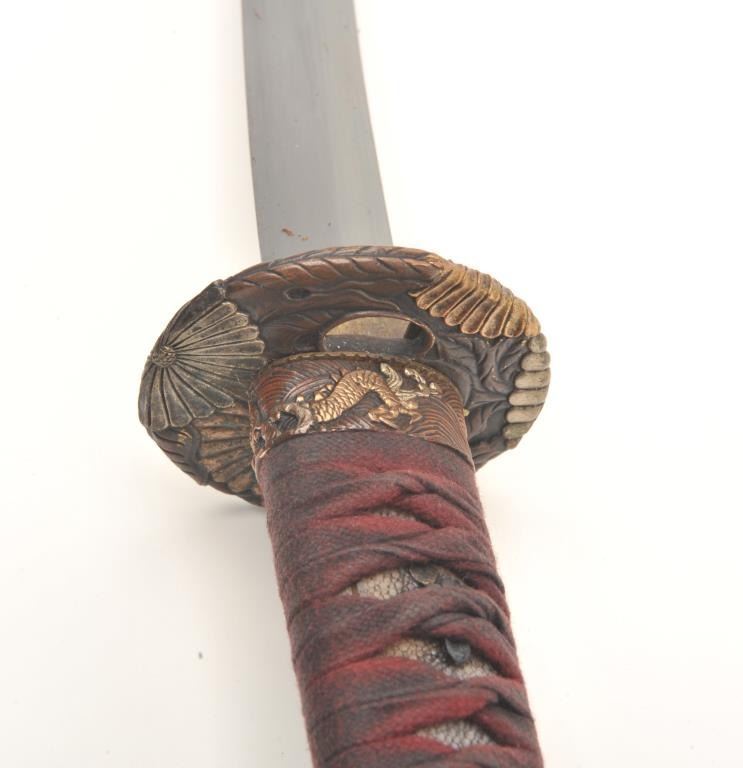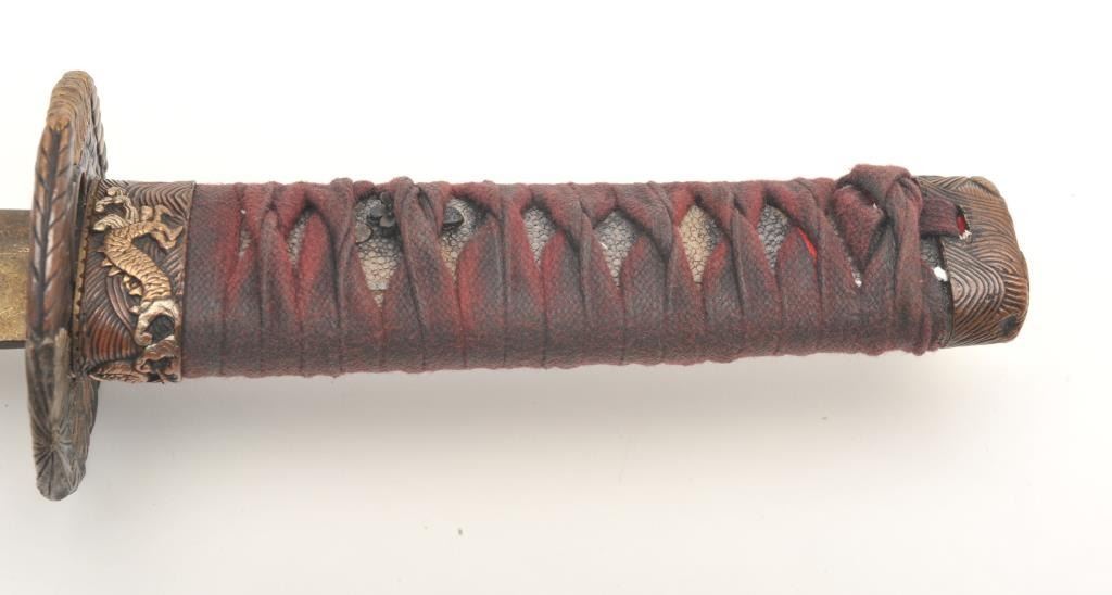 Contemporary made wakasashi in Japanese style of good quality but a reproduction. Considerably better and more accurate than most. The blade measures 14” and 21 ½” overall. Some attempts at aging. Looked gooduntil closely examined. The soft metal mounts are particularly good. Est.: $150-$300