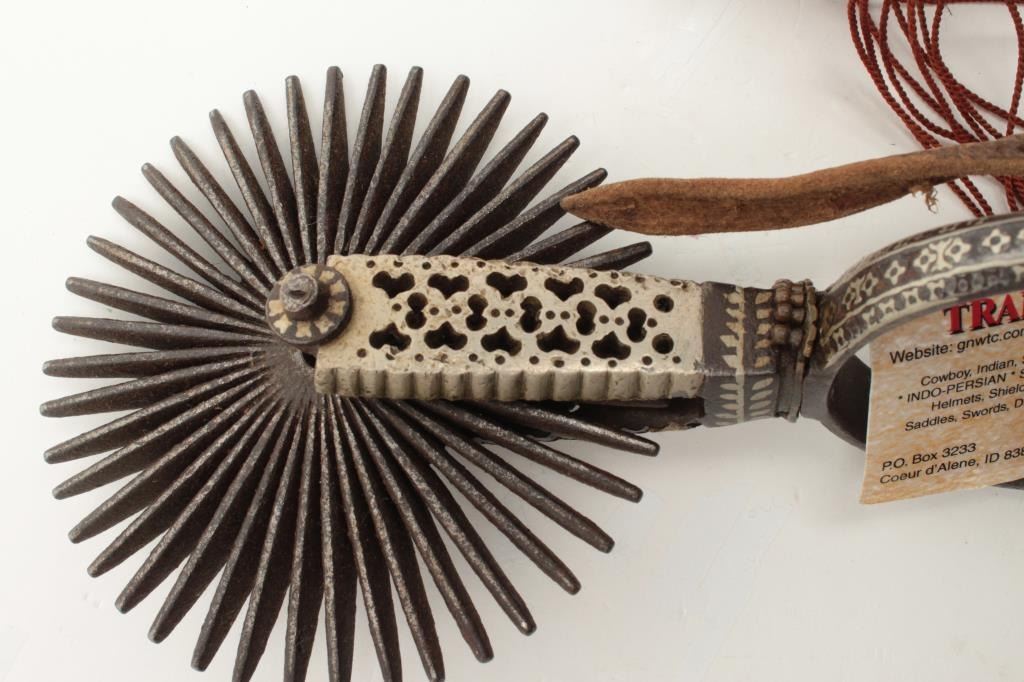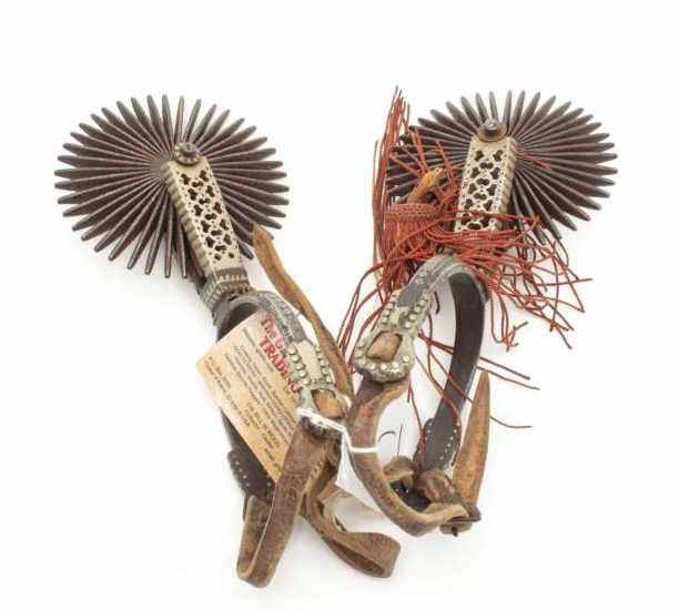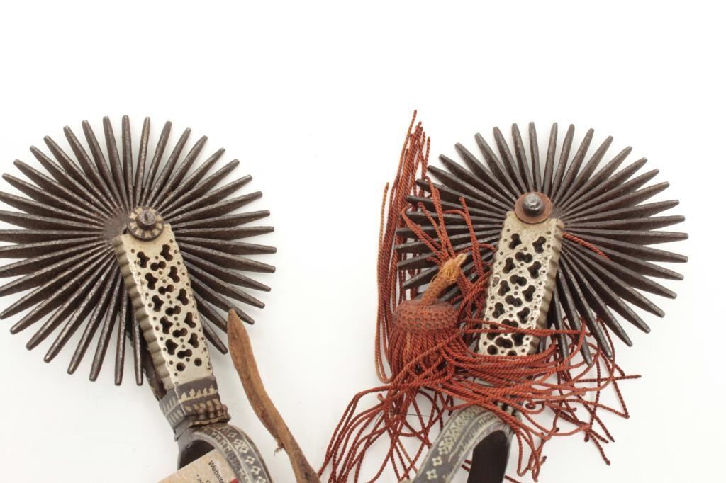 Ornate 19th century Argentine spurs. The lot includes a set of ornately decorated 19th century spurs from Argentina. The antique Spanish style spurs are silver inlayed iron and feature 4 ½” rowels. Est.: $175-$350.