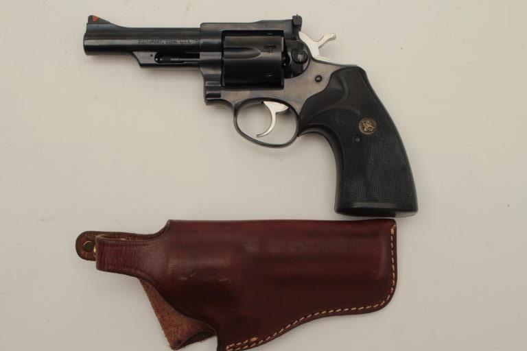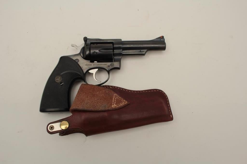Ruger Security-Six Model DA revolver, .357 Magnum caliber, 4” barrel, blued finish, checkered hard rubber combat Pachmayr grips, S/N 159-94677, in overall very good to fine condition with very good bore, crisp action,sharp markings and very good grips; accompanied by a Triple K brand leather holster. (Modern/PPT). Est.: $200-$400.