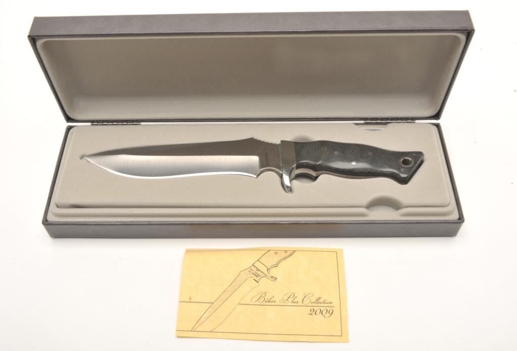Modern collector’s knife by Boker (2009); S/N 101, approximately 12” overall with 7” blade; in overall fine condition and in box. Est.: $100-$200.