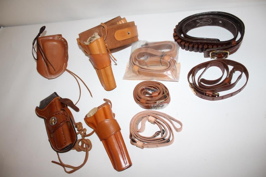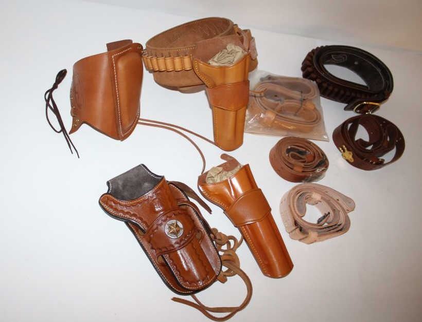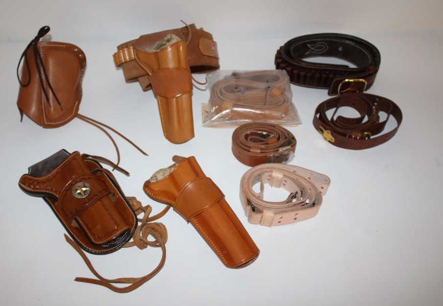 Lot of leather holsters, cartridge belts and slings, 1 tooled single loop holster for a Single Action revolver with matching cartridge belt, 1 Galco single loop holster, 4 reproduction U.S. military rifle slings, aU.S. military rifle reproduction cheek piece for butt stock and another Galco holster with matching cartridge belt. Est.: $100-$300.