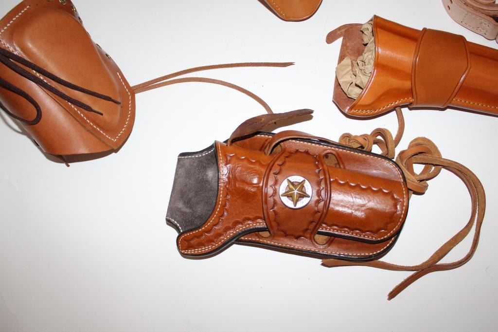 Lot 1346 Lot of leather holsters, cartridge belts and slings, 1 tooled single loop holster for a Single Act