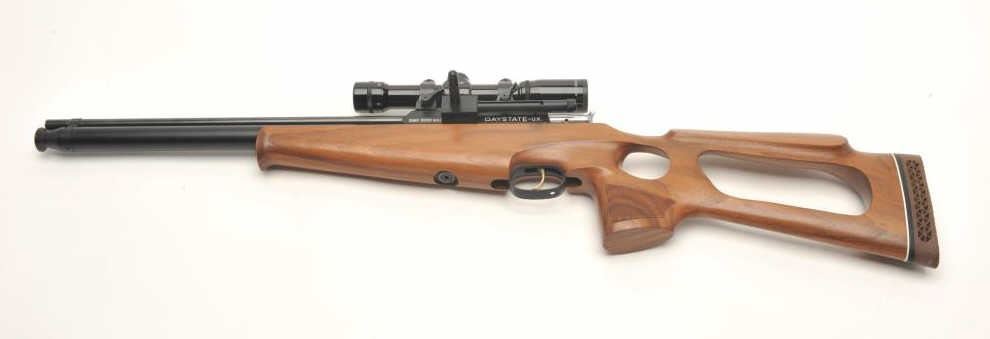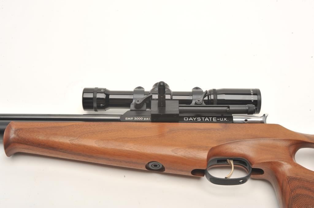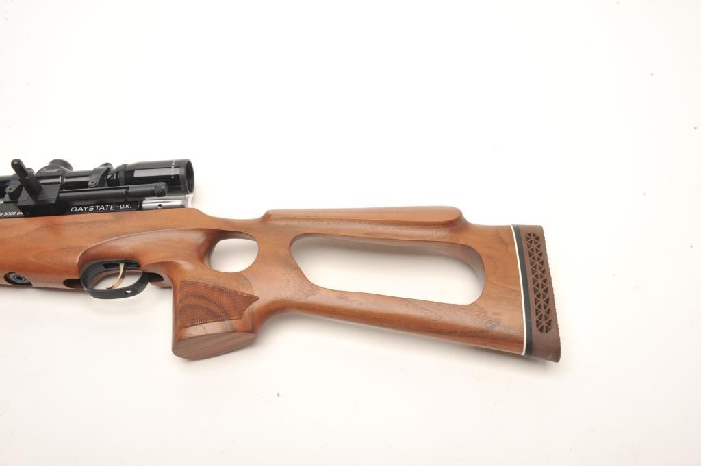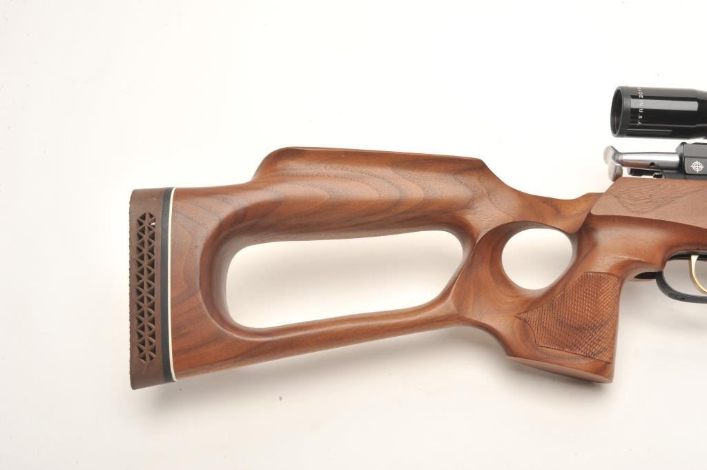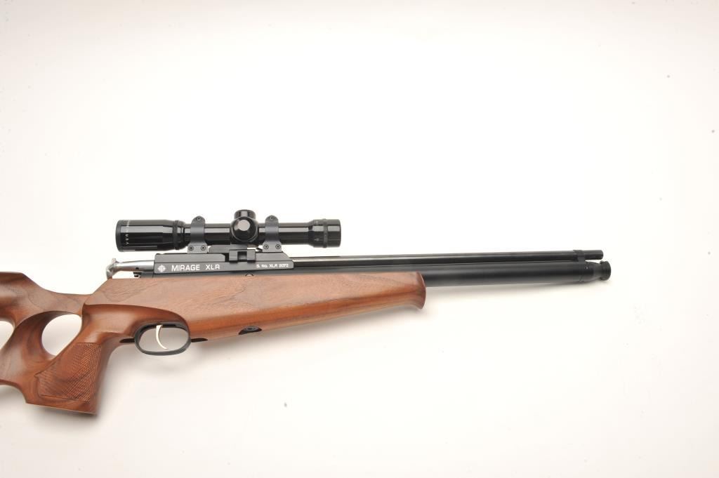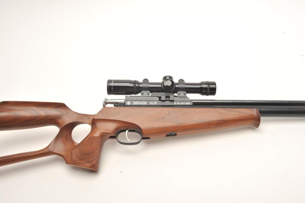 Mirage XLR pellet gun, .177 caliber, 17” barrel, black finish, checkered wood thumb hole/open wood stock, S/N XLR 2072, mounted with a Burris 4X Compact score displaying fine optics. This pellet gun is in overallfine condition with majority of original finish and fine wood; appears to be functioning at time of description. Est.: $150-$300.