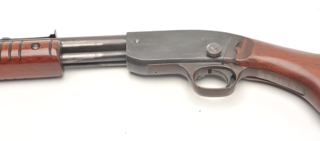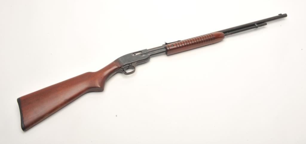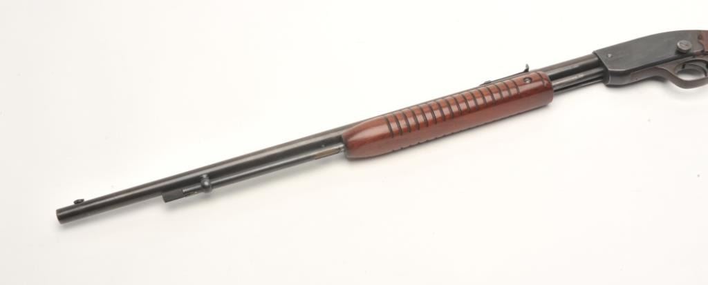 Savage Model 29B takedown pump rifle, .22 Short, Long or Long Rifle caliber, serial #NSNV. The rifle is in good overall condition with a 24” round barrel. The barrel and magazine retain a significantamount of their thinning blued finish. The receiver also shows significant muted blued finish with small mars from use. The smooth wood stocks are in good condition with some sanding and loss of finish. The butt stockends with a hard rubber butt plate. The bore is good, the markings sharp and action crisp. The lot includes an extra rear sight. (C+R) Est.: $150-$300.