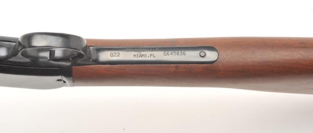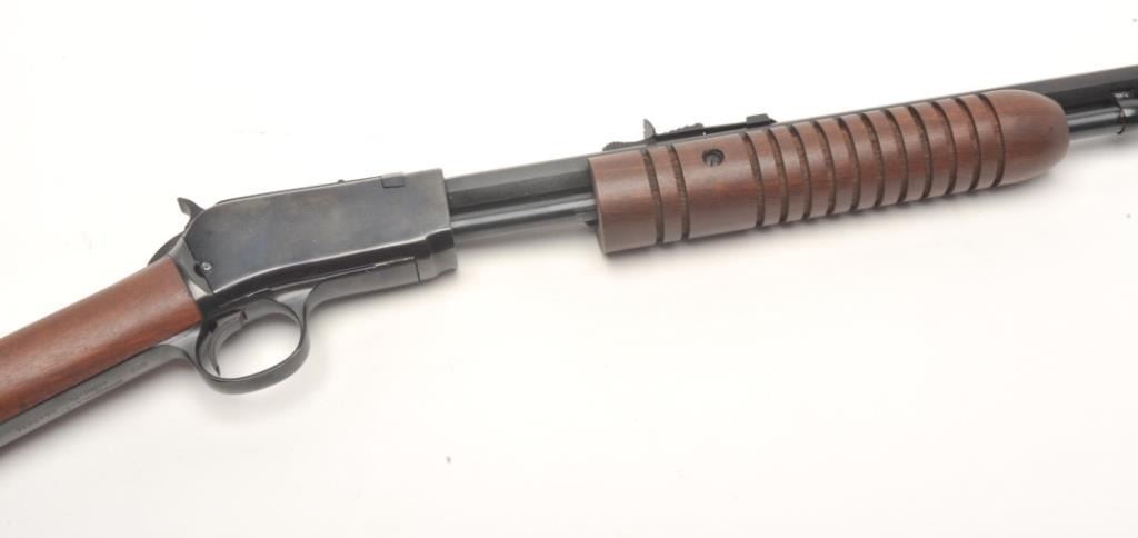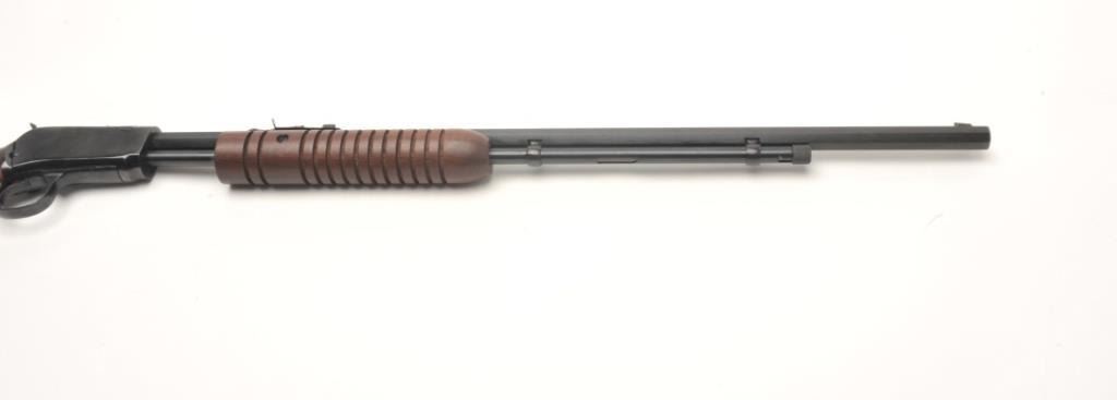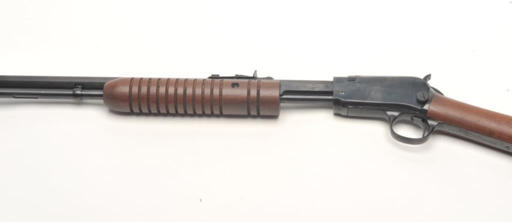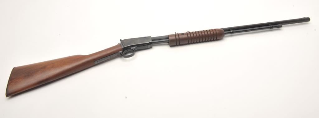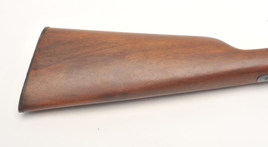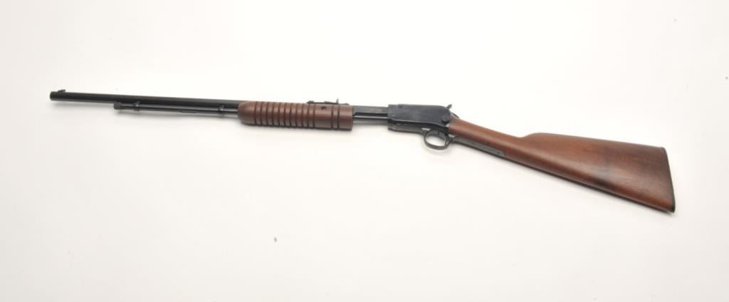 Rossi Model 90 takedown pump rifle, .22 L.R. caliber, serial #G645836. The rifle is in very good overall condition with a 23” octagon barrel with a blade front and standard rear sights. The barrel, ¾ magazine and receiver retain nearly all of their blued finish with only light handling marks noted. The smooth wood stocks are in very good condition with small mars and some finish loss on the butt stock. The buttstock ends with a plastic, Rossi marked butt plate. The bore is good, the action crisp and markings are sharp on this lightly used rifle. (Modern) Est.: $90-$180.