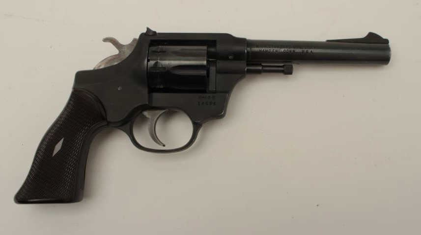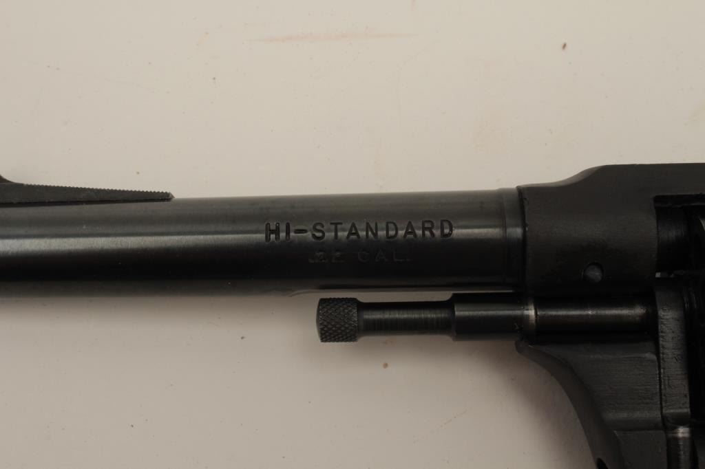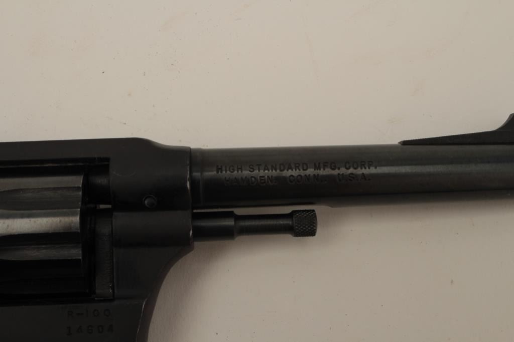 Hi-Standard Model R=100 DA revolver, .22 caliber, 5” barrel, blued finish, checkered brown plastic grips, S/N 14604, in overall very good condition showing the majority of its original finish, very good bore,markings, action and grips. (Modern/PPT). Est.: $125-$250.