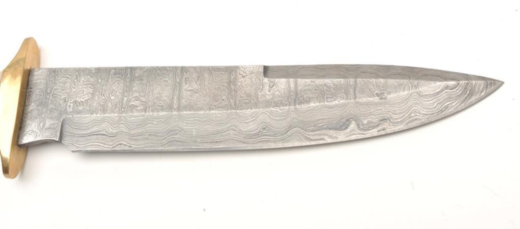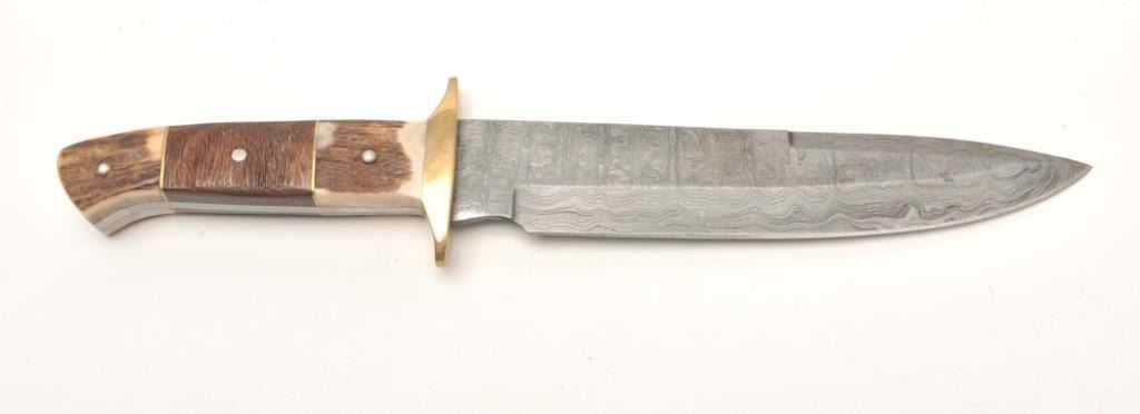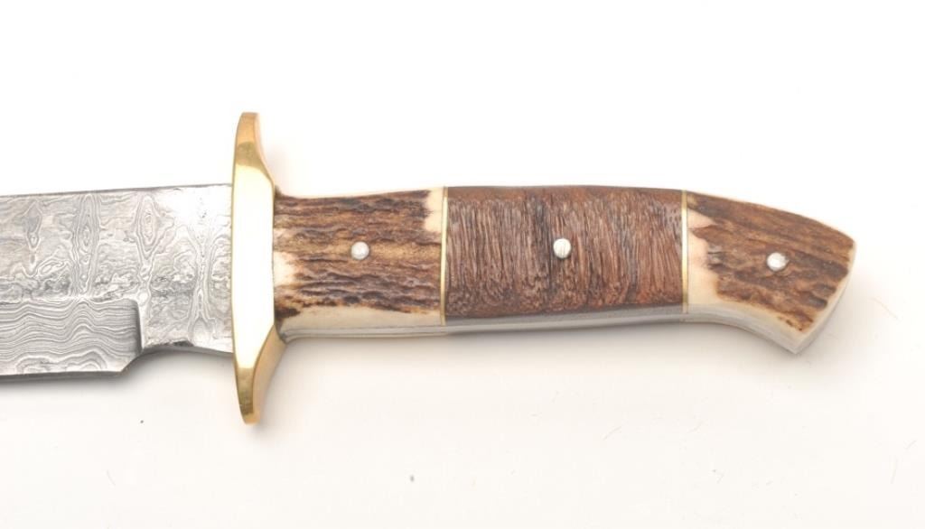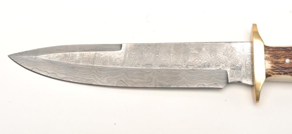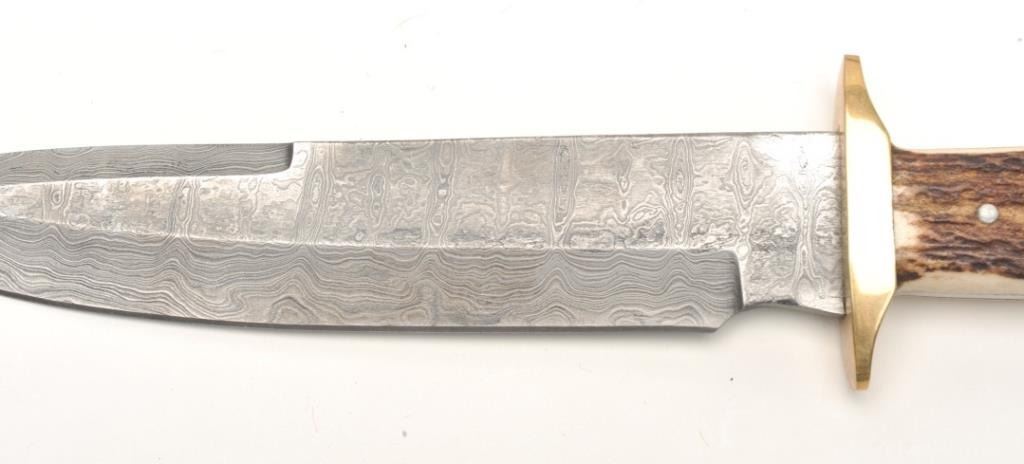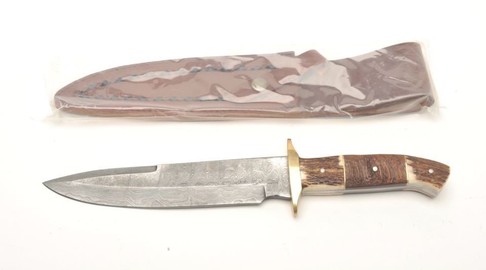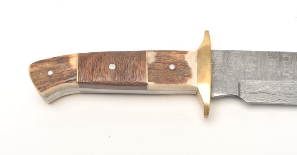 Damascus and stag grip knife, approximately 13” overall with an 8” blade in fine condition with tooled leather sheath and cardboard box. Est.: $50-$100.