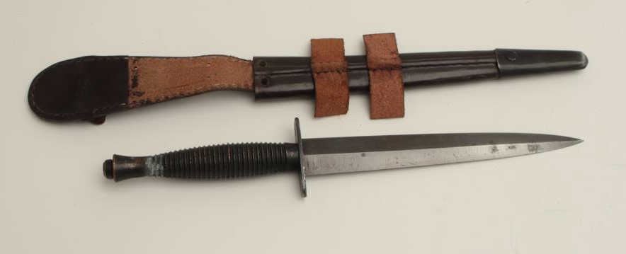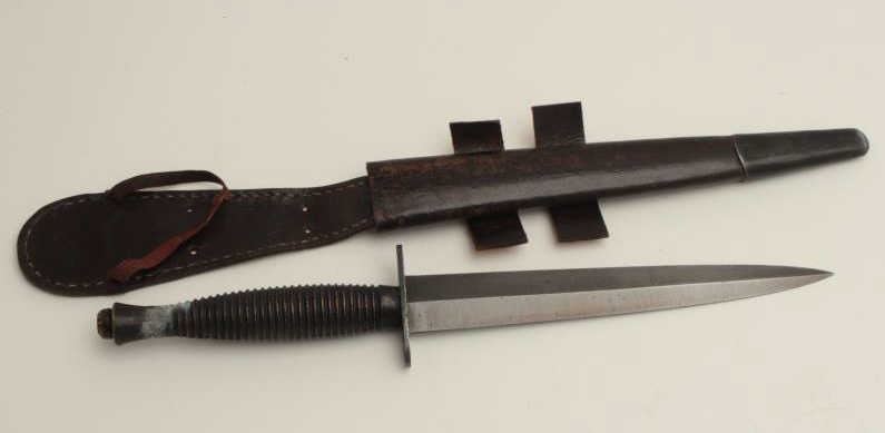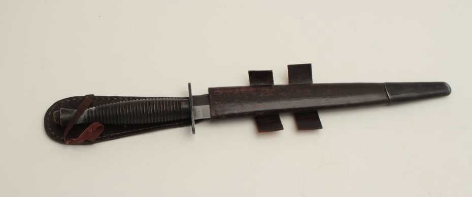 F.S. fighting knife with scabbard marked “Shefield, England”. Est.: $100-$200