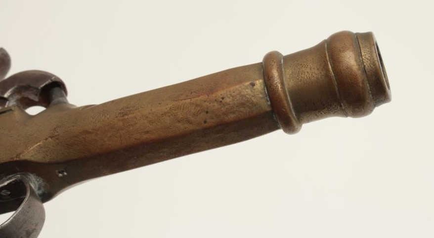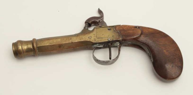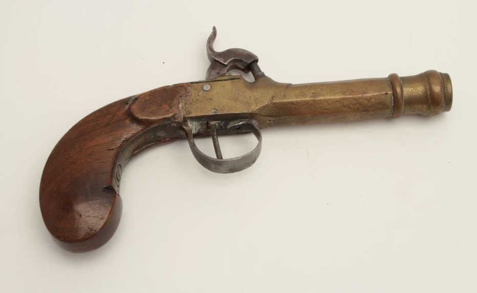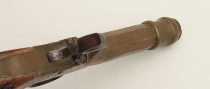 Belgian percussion brass barreled pistol, wood grip, 7.5” overall, working action, taffy colored patina to barrel/frame. (Antique). Est.: $100-$200.