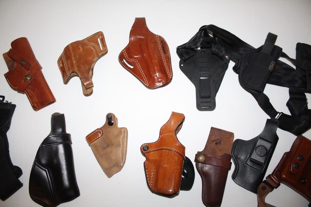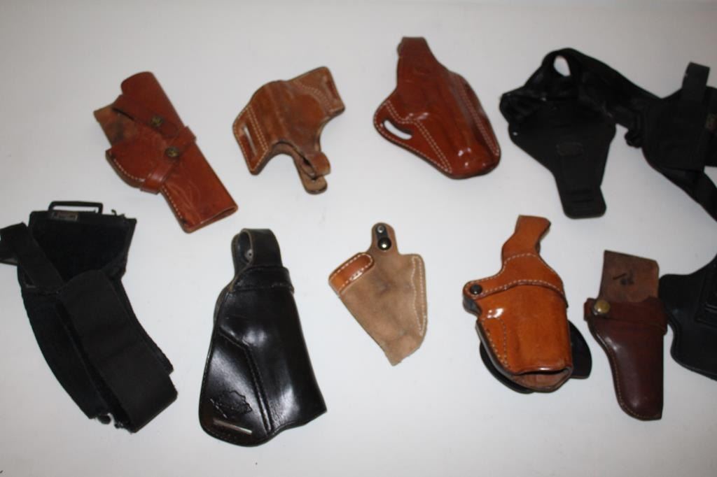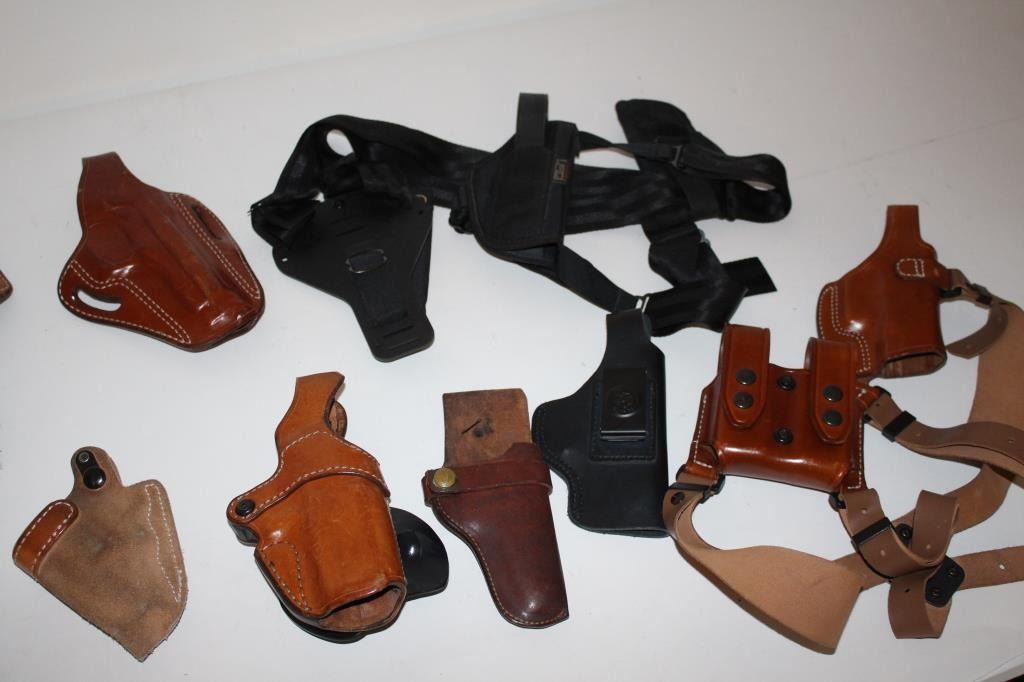 Approximately 12 misc. holsters by various makers, mostly for semi-automatic pistols, including mostly belt models, a couple shoulder holsters and an ankle holster; great lot for the gun show circuit. Est.:$75-$150.