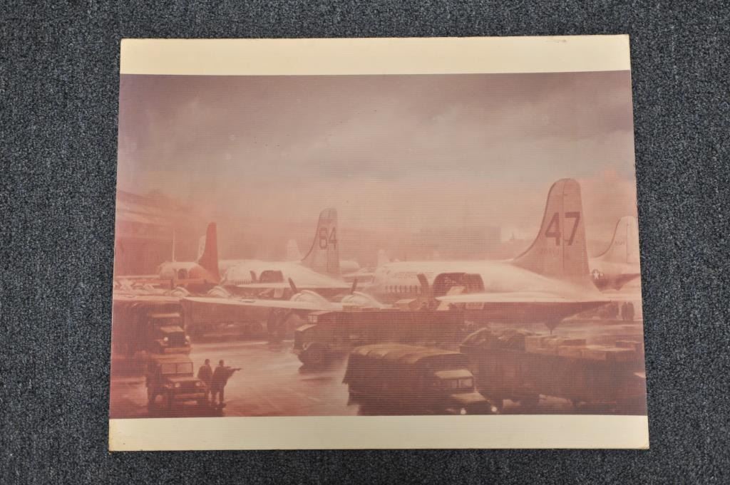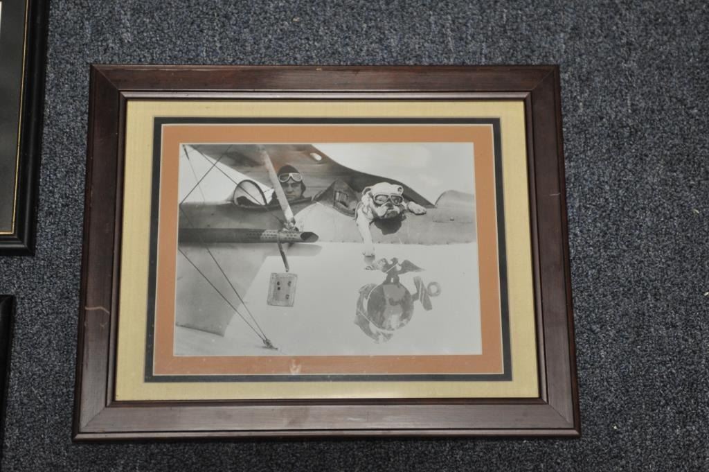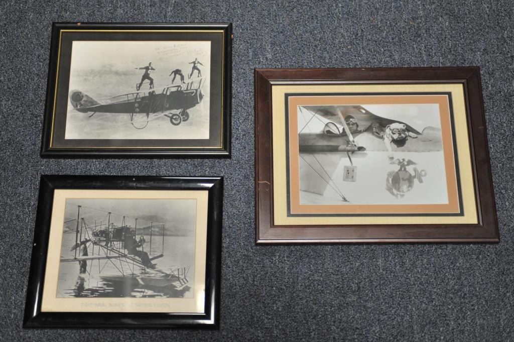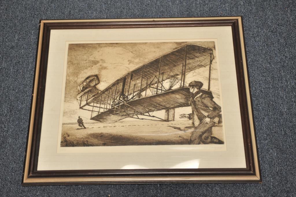Lot of 7 misc. aviation-related pieces including 6 framed and matted; one unframed, including a picture of Air Force Strata Cruisers, a Certificate of “Sink Droppers Union” dated Aug. 29, 1952 (Korea) w/photo of plane, a charcoal of the Wright Brothers’ plane at Kitty Hawk, two photos of early bi-planes, one signed by Ken “Frosty” Nichols, a sketch of a Ford tri-motor plane and a U.S. M.C. marked bi-plane with pilotand passenger bulldog. From the Bill Bettis Nieuport 17 Restaurant collection. Est.: $125-$175.