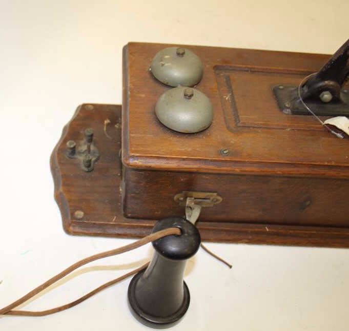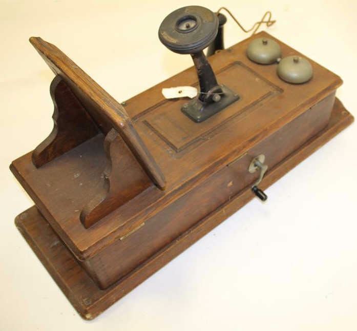 Antique wood wall phone by Monarch Telephone Co., Fort Dodge, Iowa, approximately 26” in height, 12” in width and 13” deep; un-cleaned; a great decorator item! Est.: $100-$200.