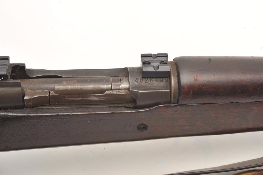 Smith-Corona U.S. Model 1903 bolt action rifle, .30 caliber, serial #4826108. The rifle is in good overall condition with a 24ā barrel with a blade front and rear sight removed. The barrel and receiver retain asignificant amount of their military finish with wear at the muzzle. The barrel is Smith-Corona marked and dated 10-43 with the flaming bomb emblem. The receiver has been drilled and tapped with Weaver styletwo-piece bases installed. The smooth wood stock shows moderate wear and has a āPā cartouche behind the trigger guard. The stock includes sling swivels, leather military style sling and ends with acheckered steel butt plate with trap. The bore is good, the action is crisp and markings are sharp. (C+R) Est.: $300-$600