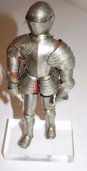 Nicely made miniature suit of armor; articulated metal and decorated; no fingers; ca. 1900-1940, on Lucite stand; approximately 9” tall. Est.: $200-$400.