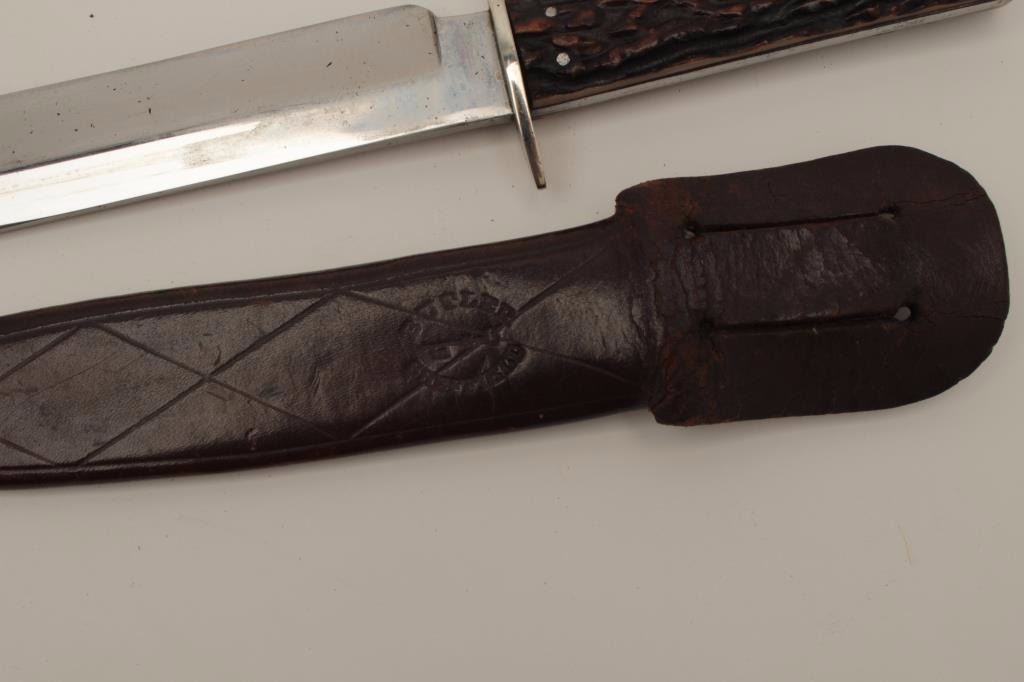 George Butler, trinity works, Sheffield marked “Key brand: spear point Bowie knife with rare original key marked and signed scabbard. Measures 11 ¼” overall with nearly 7 “blade. Lightly cleaned and sharpenedblade. Very good plus overall with inked numbers on the inside belt loop which may be museum or collection number. Est.: $700-$1400