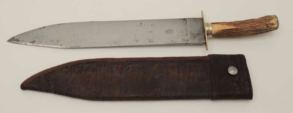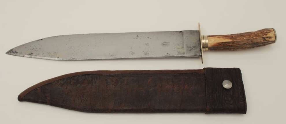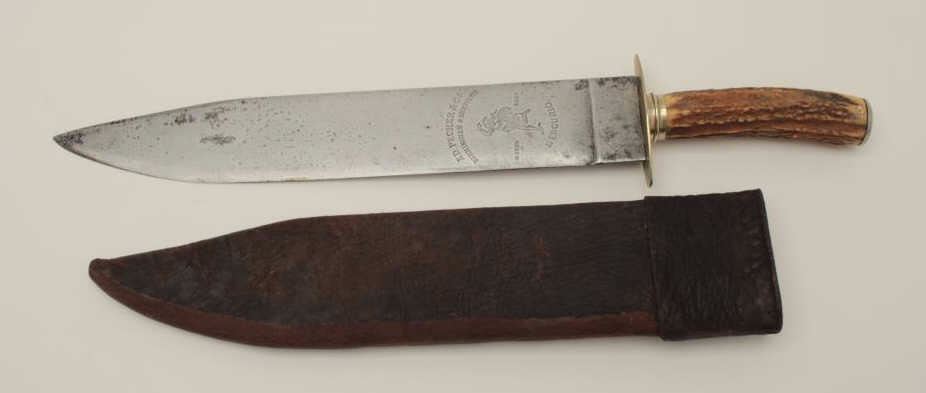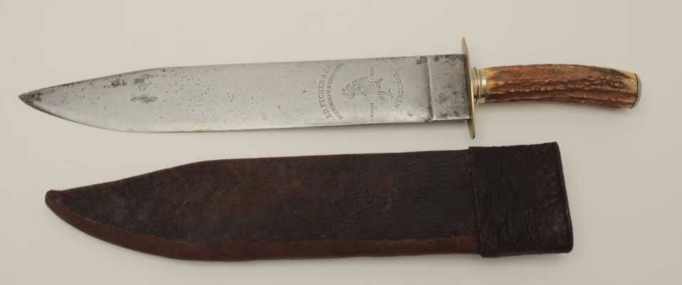 Large spear point Bowie marked “E.D. Pecher & CA, Birmingham” and “Sheffield, Mercury” and “Mecurio”. Measures 18” overall with 13” blade. The original scabbard is retained and shows yellow stag grip. Minor aging and usebut very good overall. Useful to clear brush as well as big fighting knife for Mexican or South American market. Est.: $900-$1800