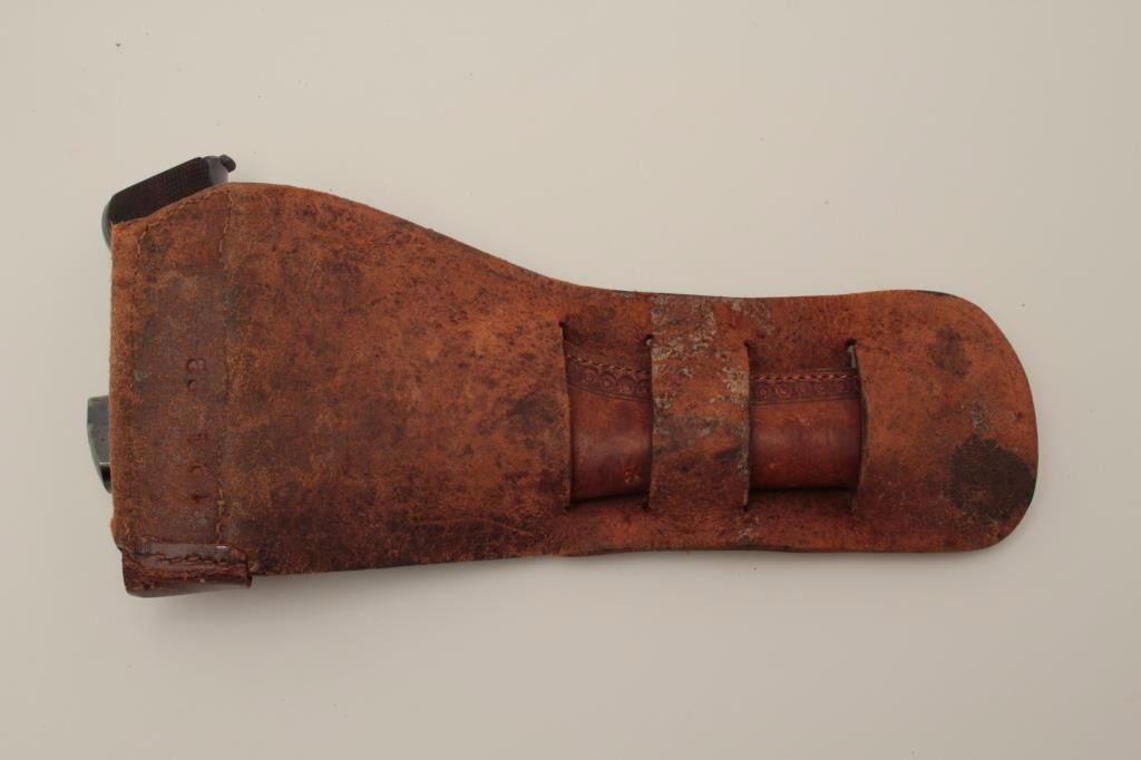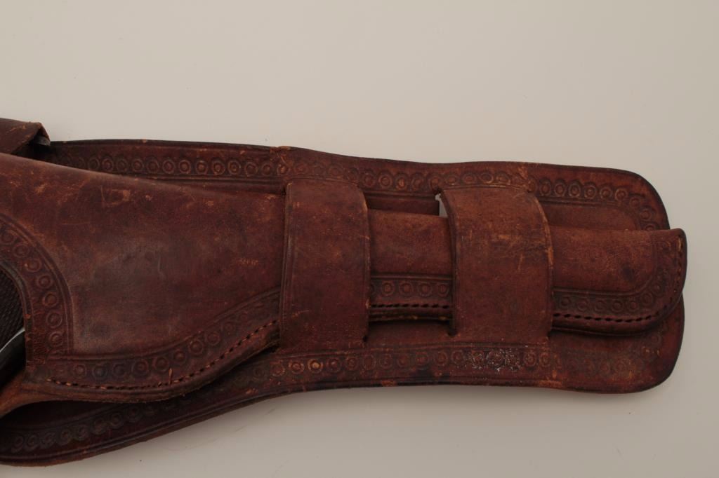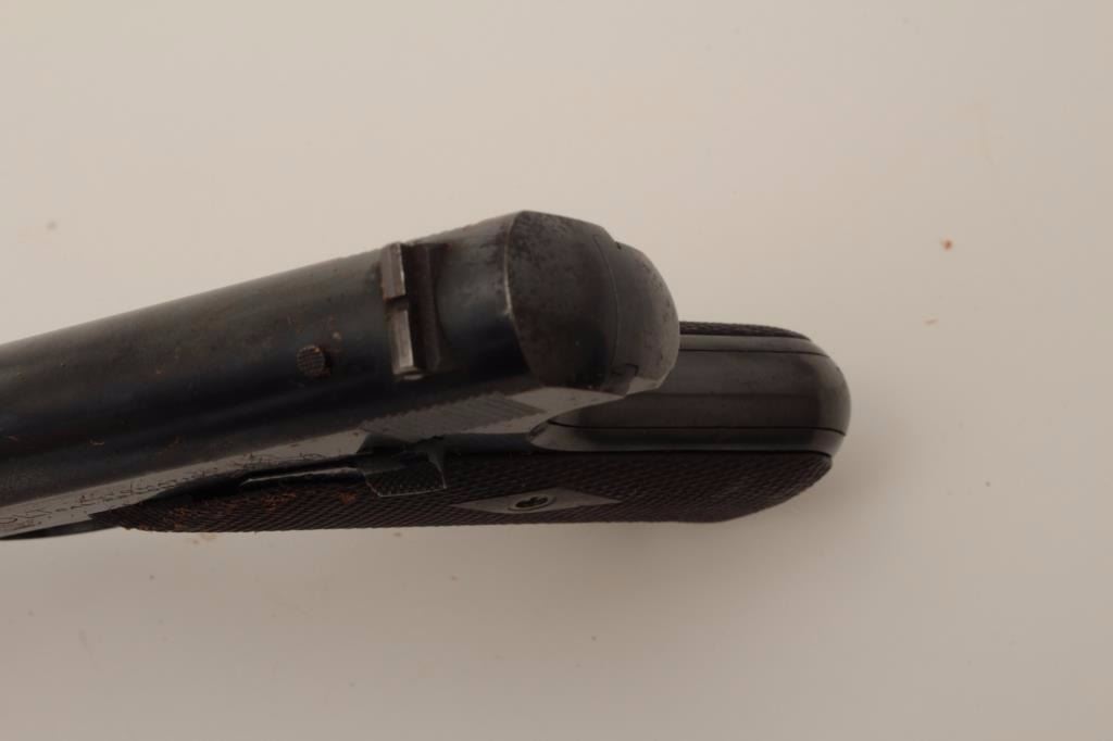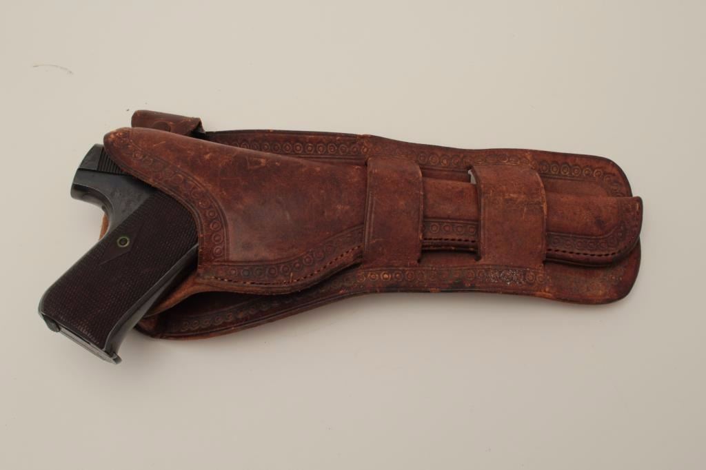 Colt Pre-Woodsman .22 caliber semi-auto pistol with a 6 ½” barrel, S/N 19793 with early slim Jim western holster included showing double loop and clip holder (Early 2 tone extra clip included). The pistol wasmade 1913-1914 and retains 96%-98% original blue with some “Smutz” from holster that may clean. One area of spotting and begging erosion at the rear of the address. The grips are early diamond checkered correct type and are almost fine. The bore is excellent. 2 woodsman two-tone mags in this lot. Estate consigned. (C&R/NO PPT) Est.: $600-$1200