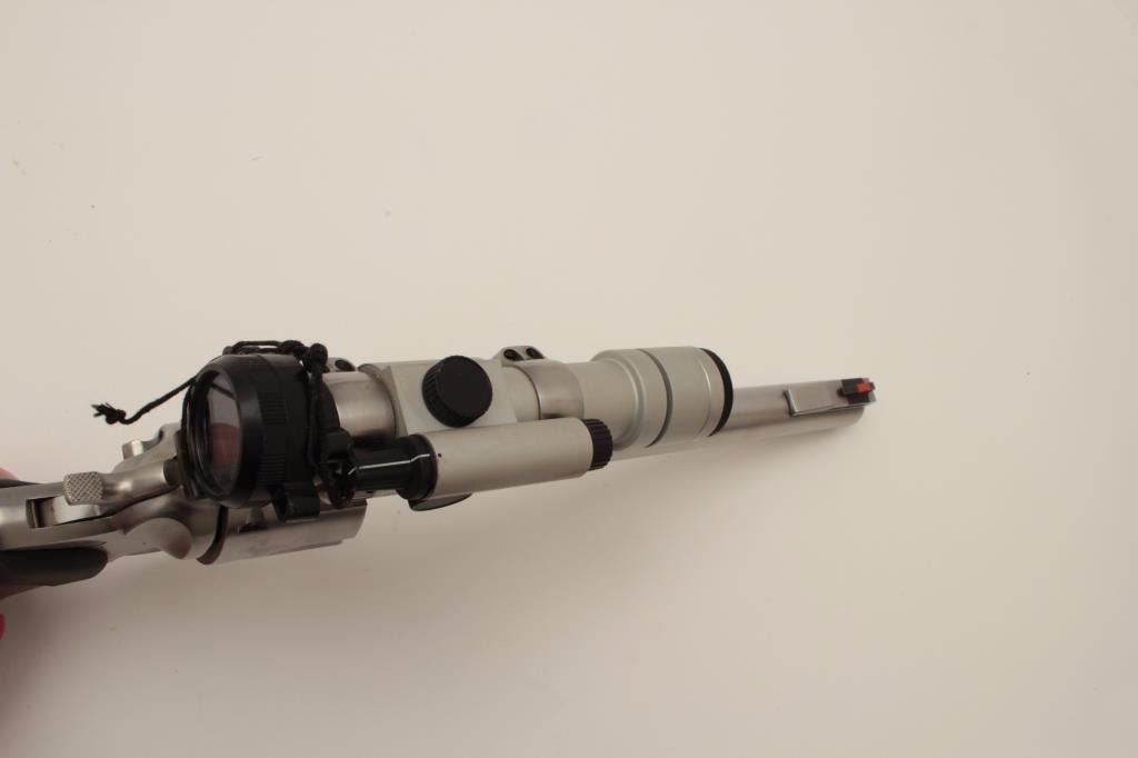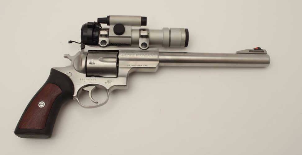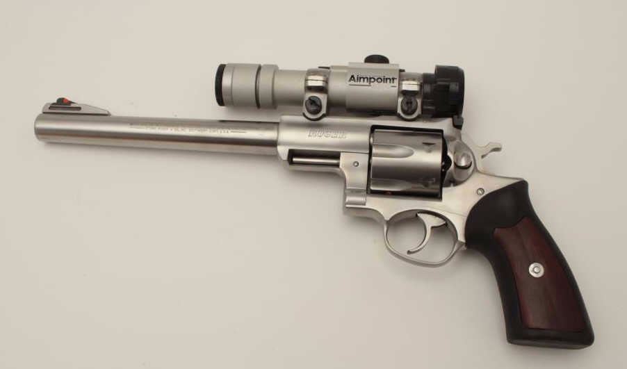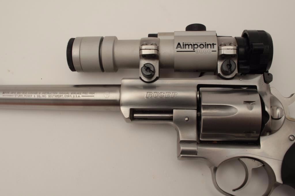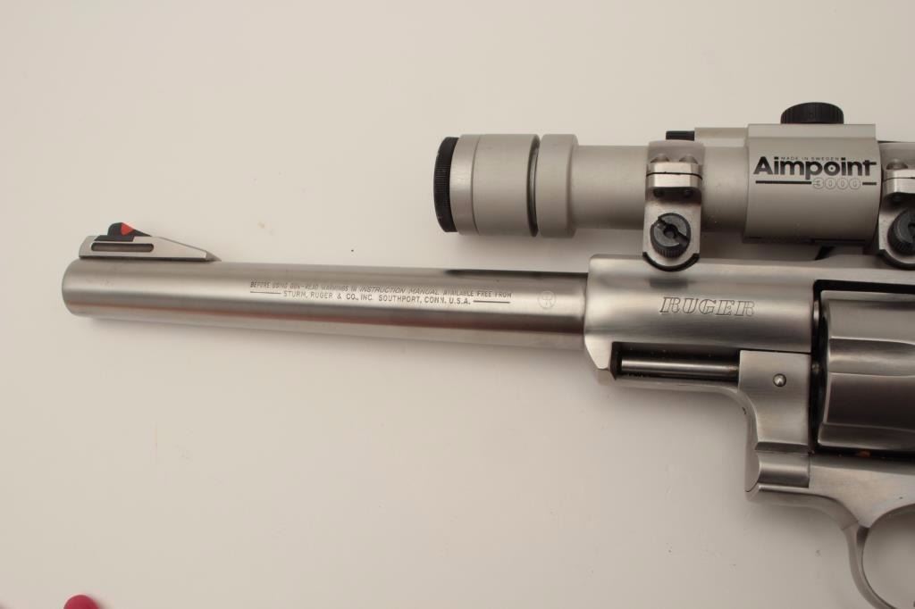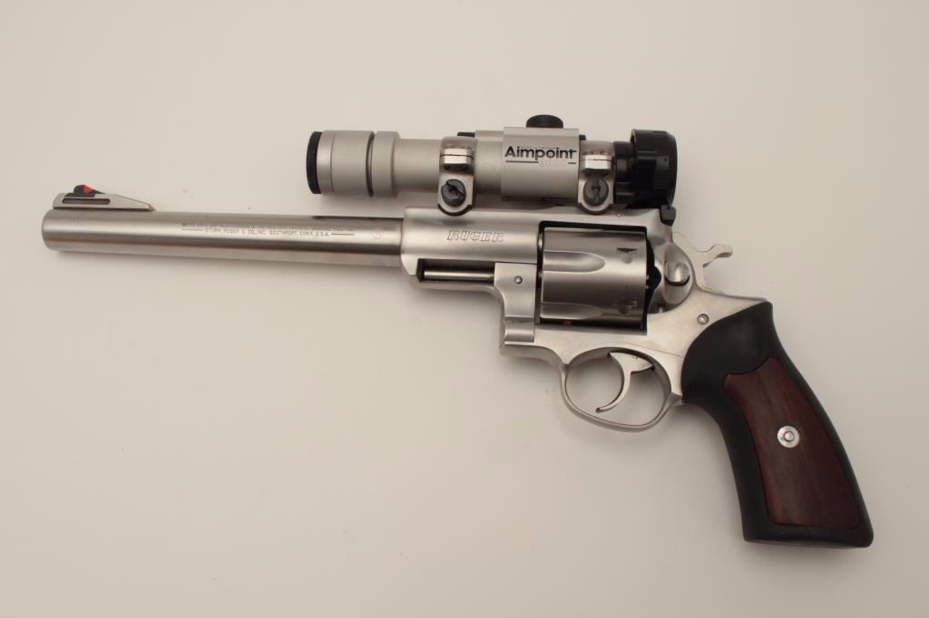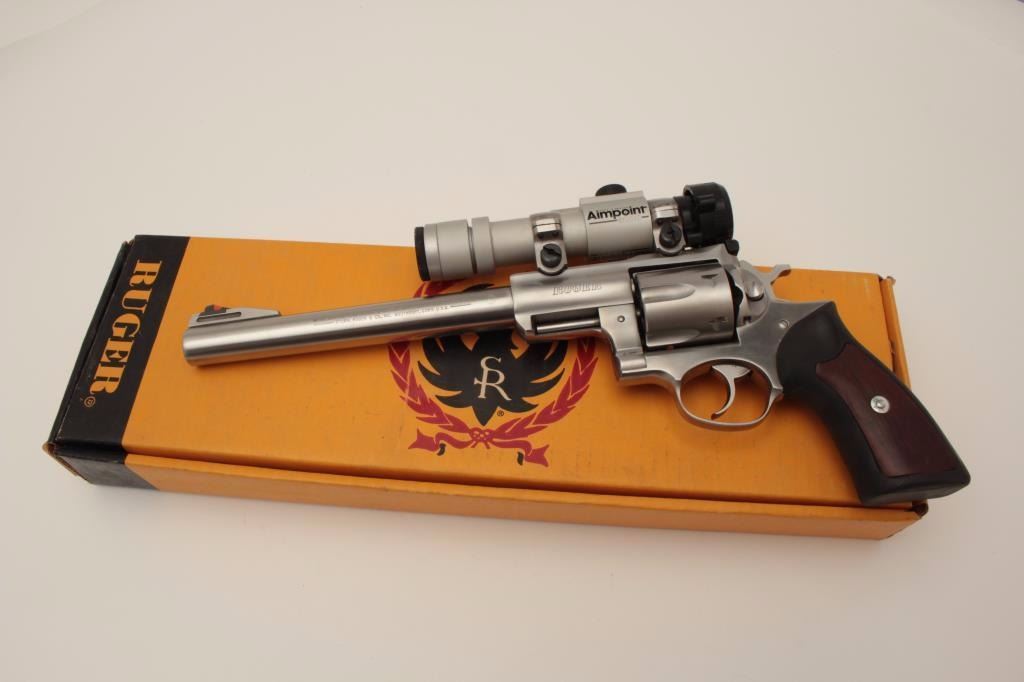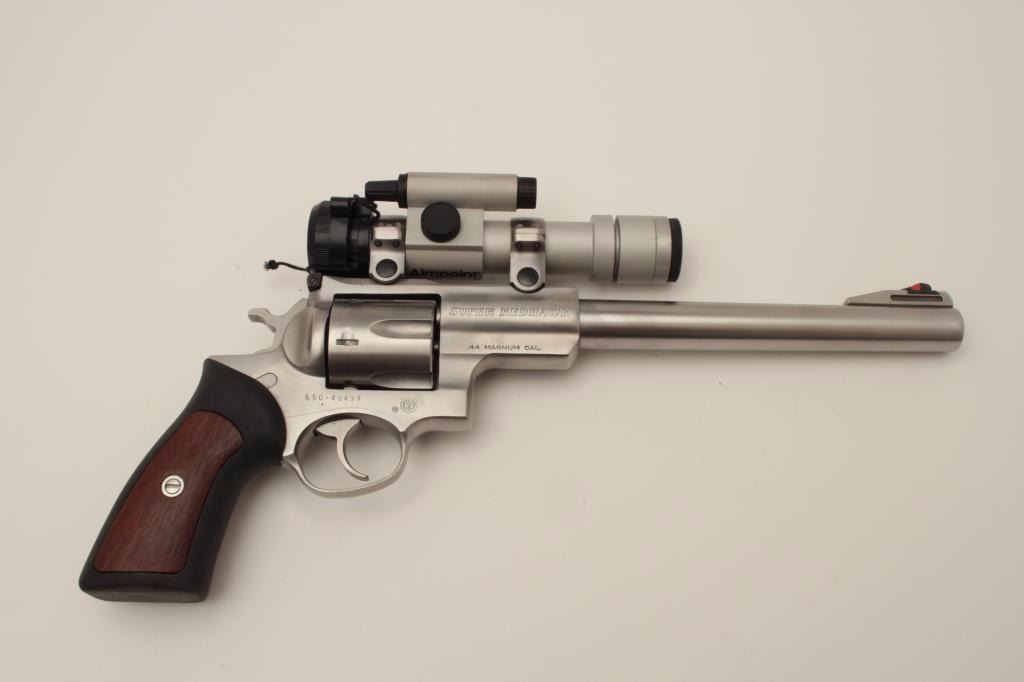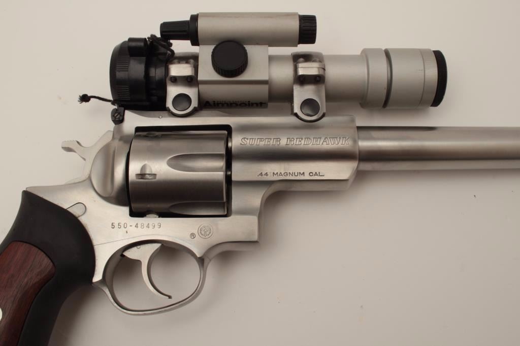 Ruger Super Redhawk Model DA revolver, .44 Magnum caliber, 9.5” barrel, stainless, composite grips with wood insets, S/N 550-48499, with factory cardboard box; gun is mounted with an Aimpoint 3000 scope withgood optics. This gun is in overall very good to fine condition with a fine bore, crisp action, sharp markings and fine grips. (Modern). Est.: $450-$900.