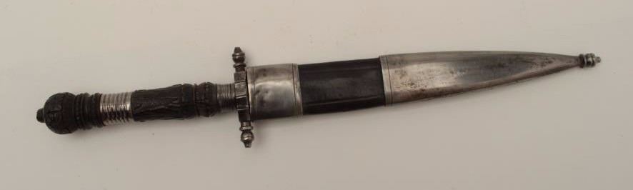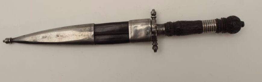 Finely made 18th to 19th century European dagger with scabbard. Measures 11” overall with a 6 ¾” blade. Beautifully filed and turned steel guard with quality blade showing thick or reinforced ricasso. Carved andturned blackened wood grip (Ebony?). Turned steel bands with scabbard. Has a southern Italian look or style. Est.: $250-$500