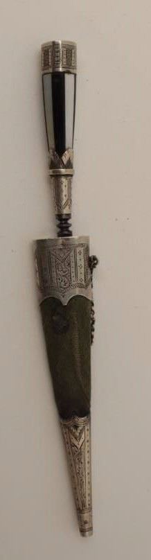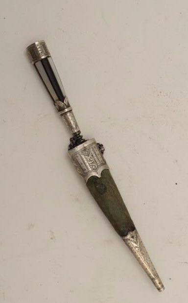 19th century vendetta dagger of miniature size etched “Vendetta, Morta” (Revenge and death). measures 4 ½” overall with a 2 ¼” blade. Silver mounts with original scabbard. Alternating pearl and select dark wood grip.Fine condition. Est.: $300-$600