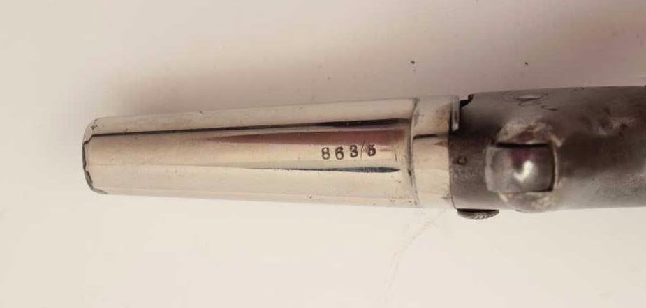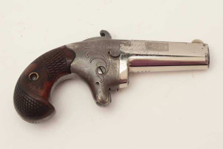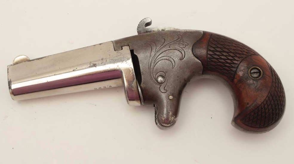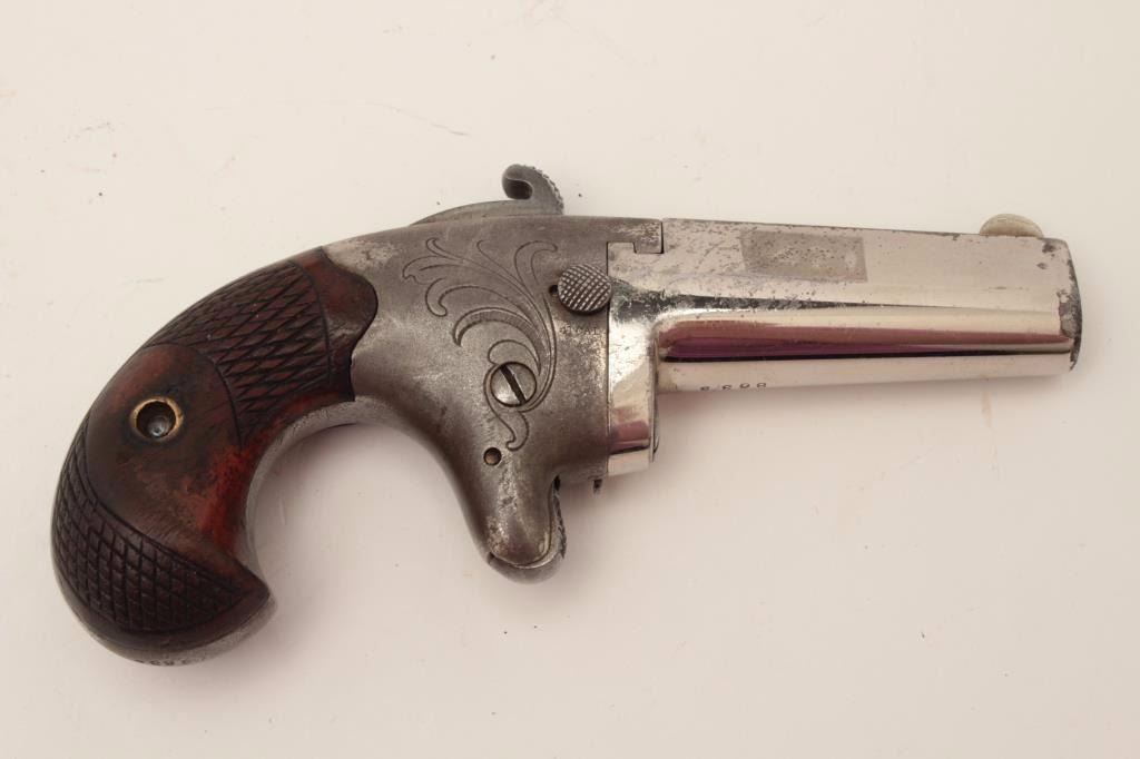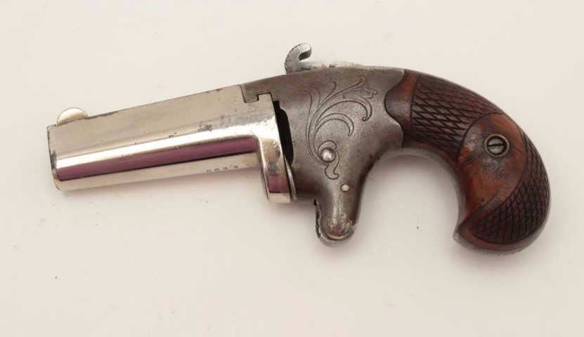 Colt #2 Derringer, .41 caliber, 2.5” barrel, engraved frame, nickel finish, checkered wood grips, S/N 8635, in overall very good condition with majority of original finish on barrel, grey patina on frame, crisp actionand markings, fair bore, very good grips. (Antique). Est.: $700-$1,400.