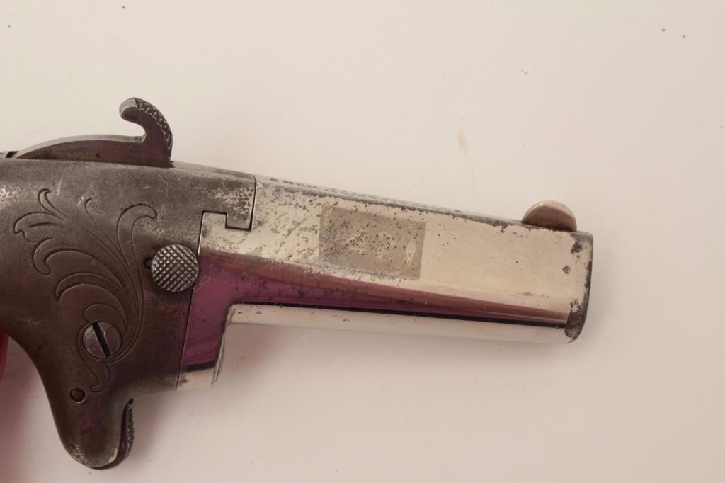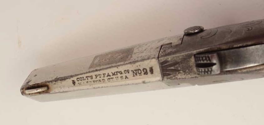 Lot 1457 Colt #2 Derringer, .41 caliber, 2.5” barrel, engraved frame, nickel finish, checkered wood grips,