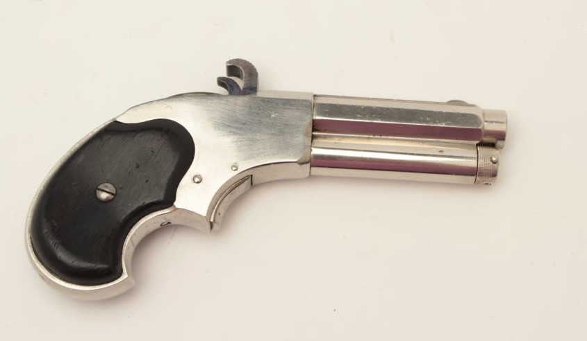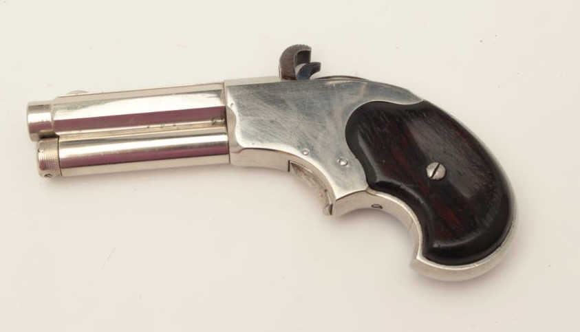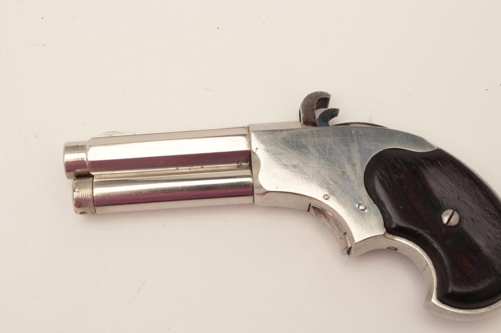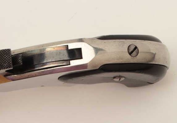 Remington-Rider Magazine pistol, .32RF extra short caliber, 3.25” barrel, nickel finish, wood grips, no visible S/N, in overall very good to fine condition displaying the majority of its original finish, crispaction, clear barrel address, good bore with some scattered light pitting, very good + wood grips. (Antique). Est.: $700-$1,400.