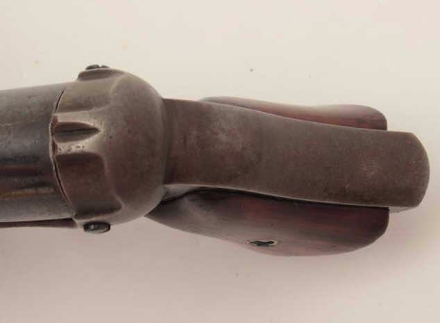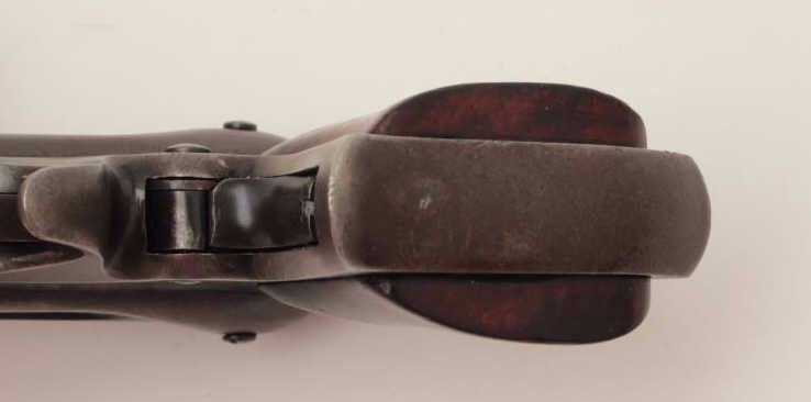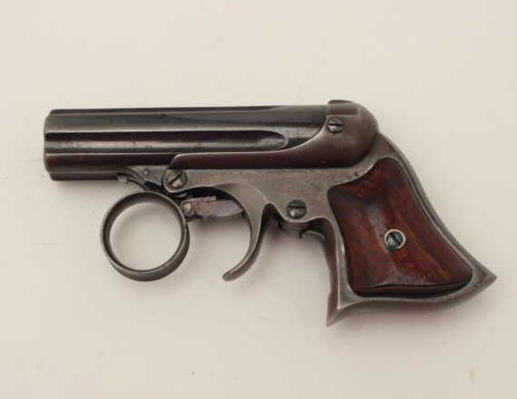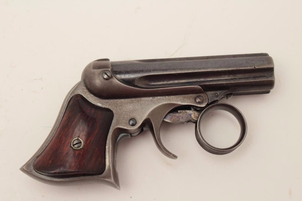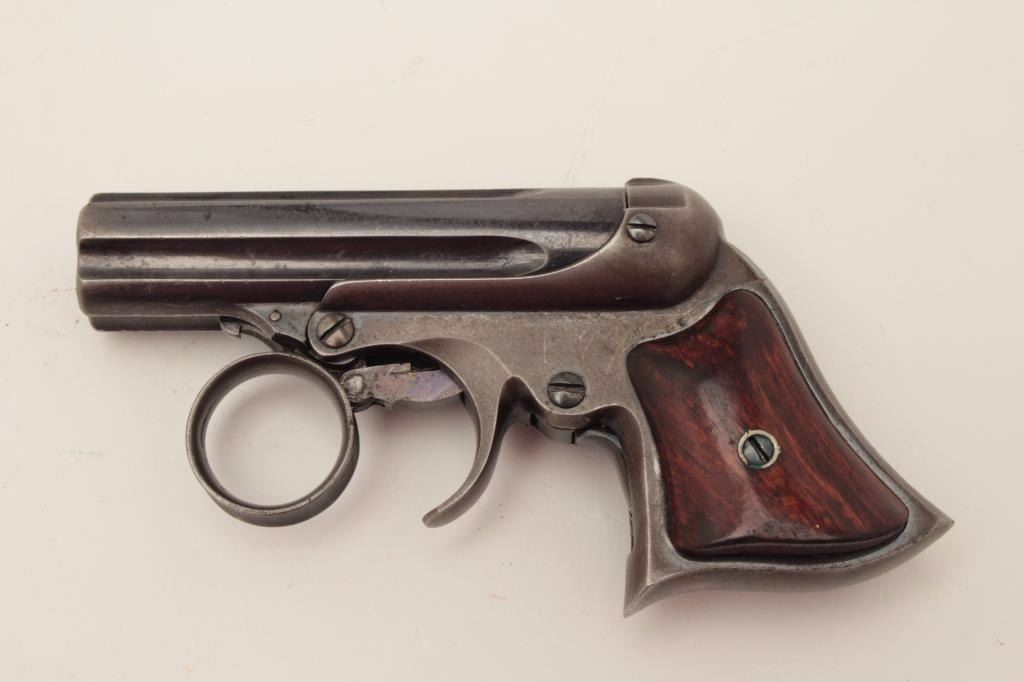 Remington-Elliot 5-shot ring trigger derringer, .22RF caliber, 3” barrel assembly, blued finish, wood grips, S/N 8668, in overall very good to fine condition displaying the majority of its original bluefinish on the barrel assembly with traces of original blue in protected areas of the frame, good bores, crisp action, sharp markings and fine grips. (Antique). Est.: $700-$1,400.