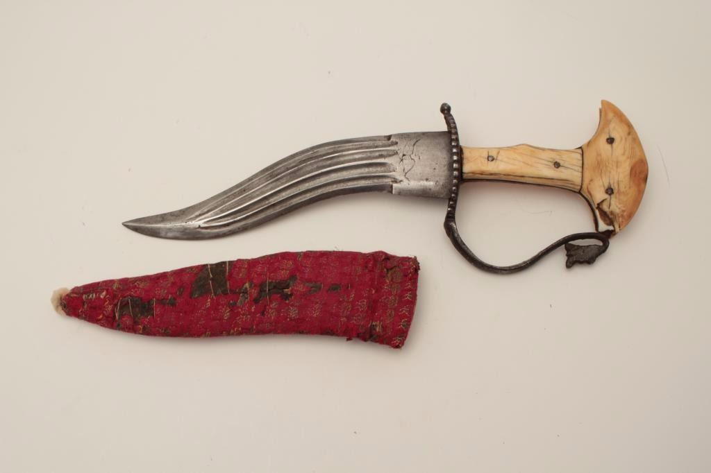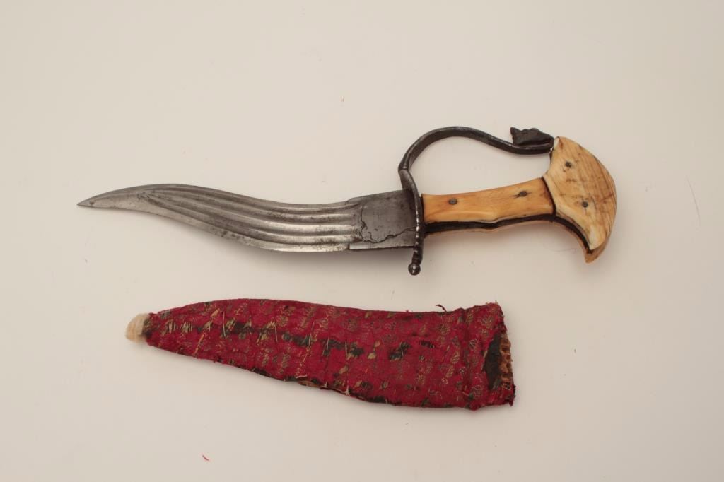 Early Indian khanjar dagger circa 18th to 19th century with original ivory grip, forged steel guard and fabric covered over wood original scabbard. 4 grooves in blade and very good quality. Minor losses to the gripand aging. A scarce example of real and early armoral daggers. The scabbard shows small losses and aging. Est.: $700-$1400