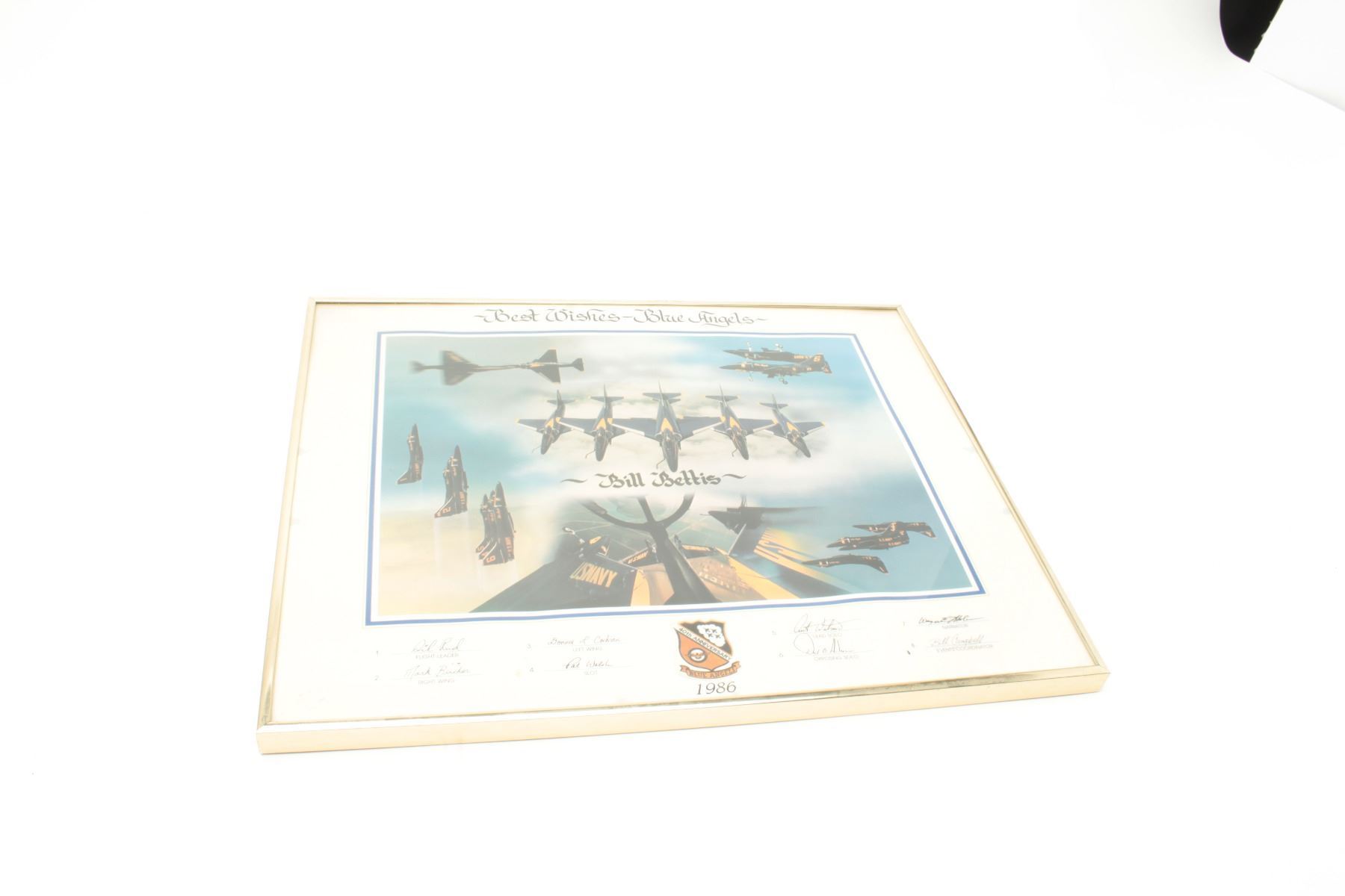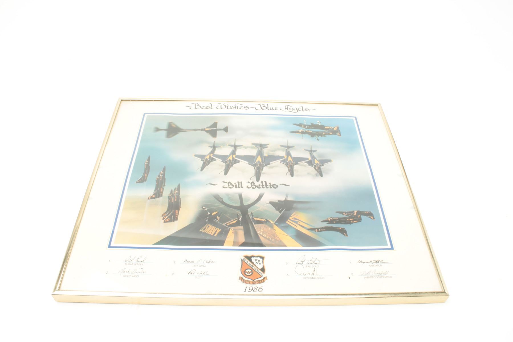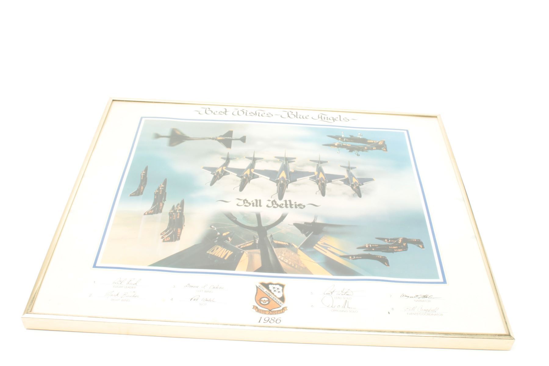 Lot of 2 framed and matted pieces of U.S. Blue Angels photos given to Bill Bettis, owner of the Nieuport 17 restaurant in Tustin, CA., one small frame, approximately 16” x 21” overall showing the Blue Angels in formation and celebrating the 40th Anniversary (1986) of the group, indicating best wishes to Bill and hand-signed by eight members of the team; also a large piece with 10 photos of the Blue Angels plus a patch and center plaque dated 1997, making Mr. Bettis an “Honorary Blue Angel”; approximately 30” x 38” overall. From the Bill Bettis Nieuport 17 Restaurant collection. Est.: $175-$350.