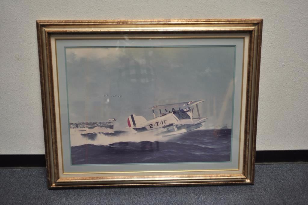 Beautifully framed and matted print of a World War I American seaplane in action with an aircraft carrier in the background. The print depicts a US bi-plane at sea with an aircraft carrier launching an additionalaircraft. A flight of three bi-planes are observed in the background as well. The print is double matted and professionally framed. The print, which measures 48” by 36”, is from the Bill Bettis, Nieuport 17Restaurant collection. Est.: $150-$300.