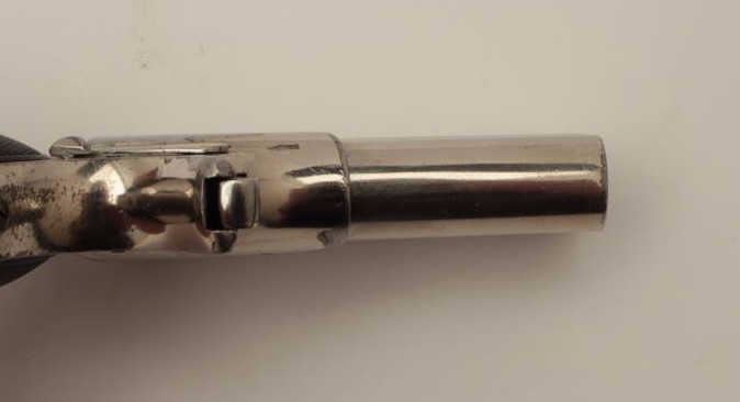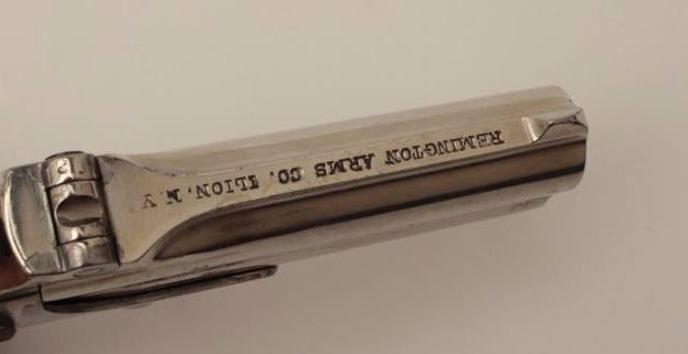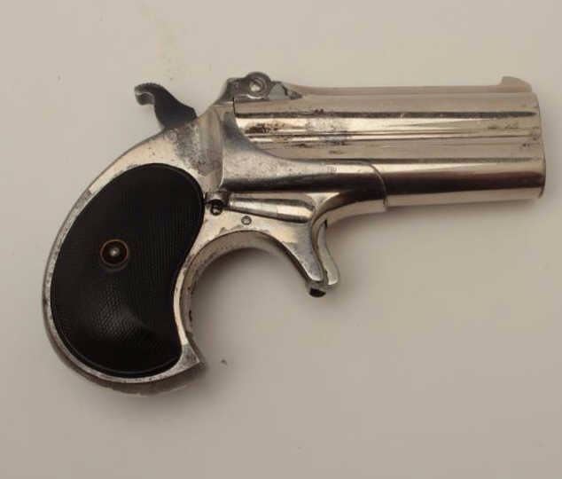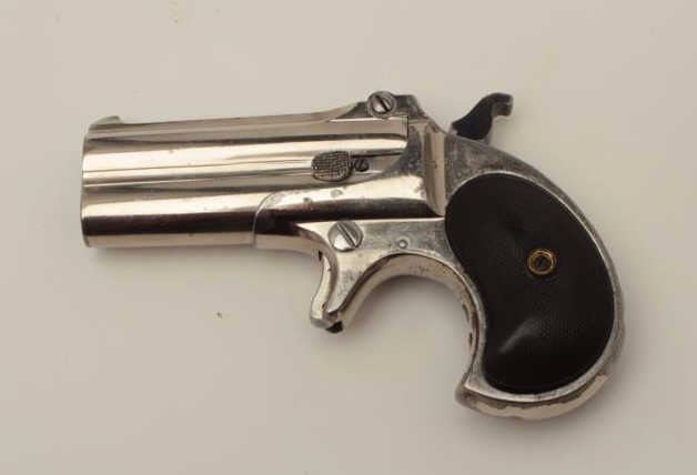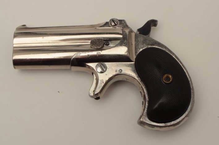 Lot 1473 Remington Double O/U derringer, type II, .41RF short caliber, 3” barrels, nickel finish, checkere