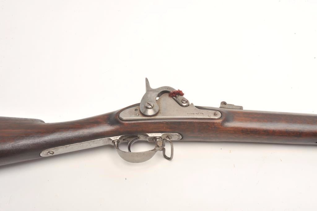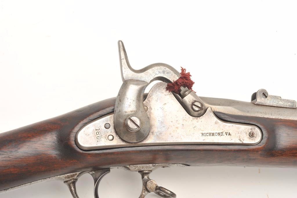 Modern made high quality reproduction of Confederate Richmond rifled musket in .58 caliber showing spurious Richmond marks and 1864 date even the stock cartouche. Very well detailed and faithful to the original. Forthe Confederate reenactor who wants the best. Excellent condition. Est.: $500-$1000