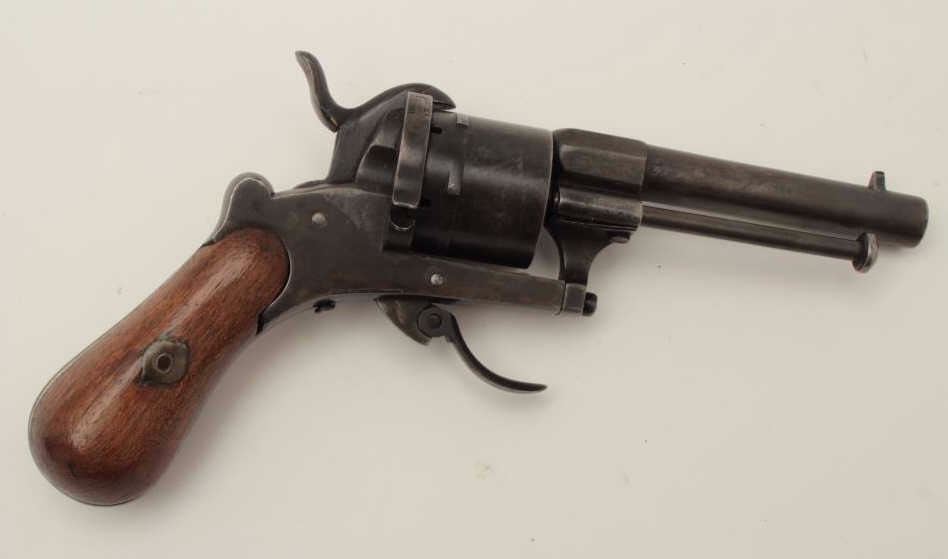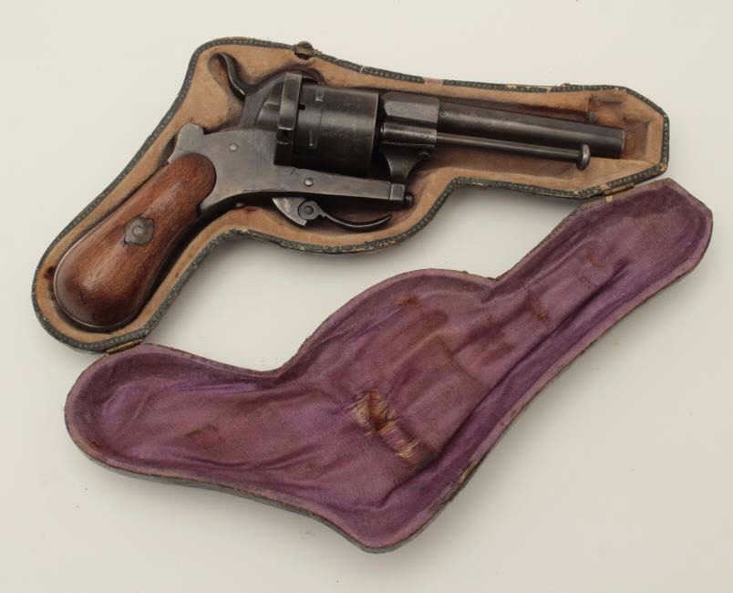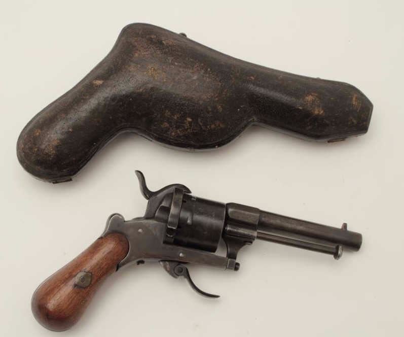 Pinfire revolver in original pipe case, 7.65mm caliber, 3.5” barrel, wood grip, action needs adjustment; pipe case is overall good to very good. (Antique). Est.: $400-$800.