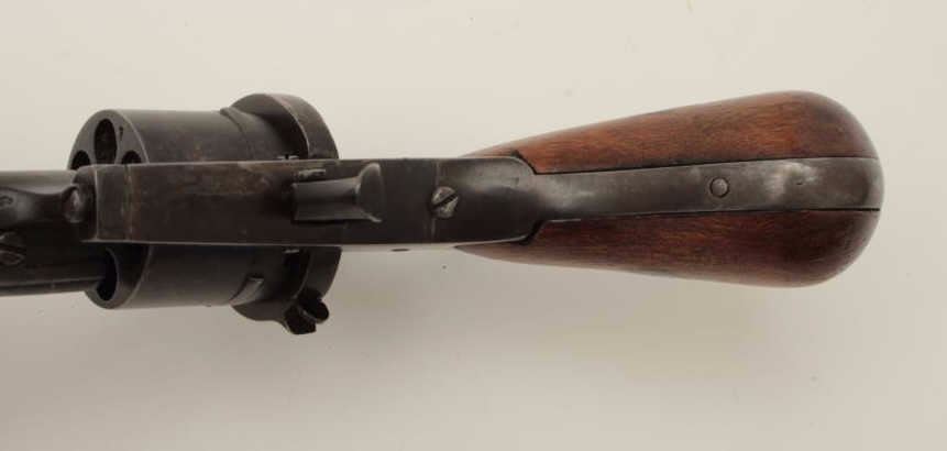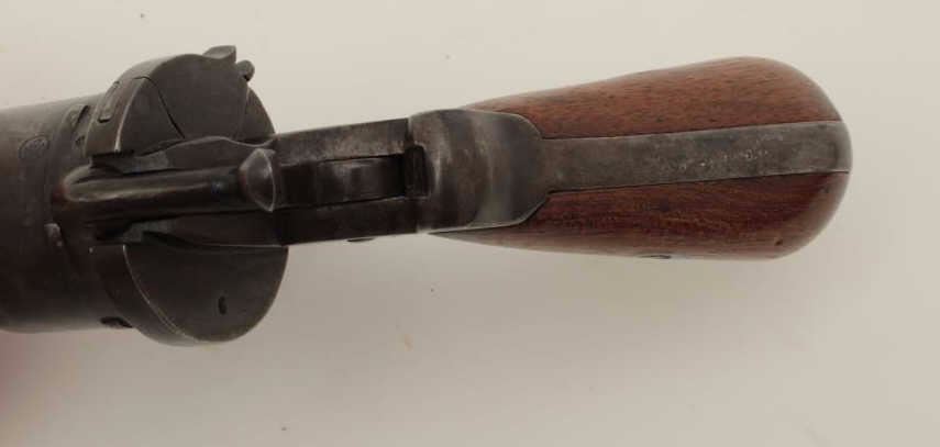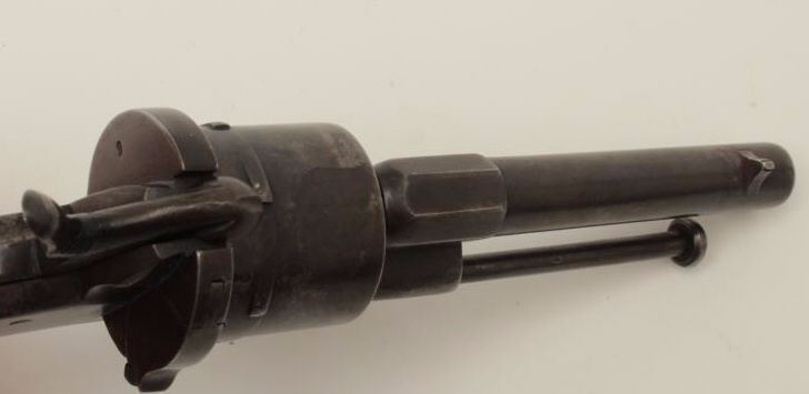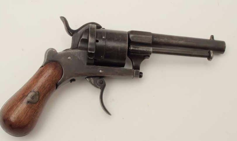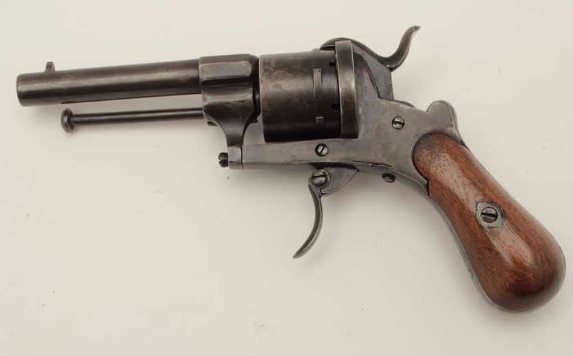 Lot 1477 Pinfire revolver in original pipe case, 7.65mm caliber, 3.5” barrel, wood grip, action needs adjus