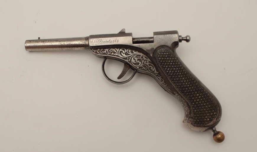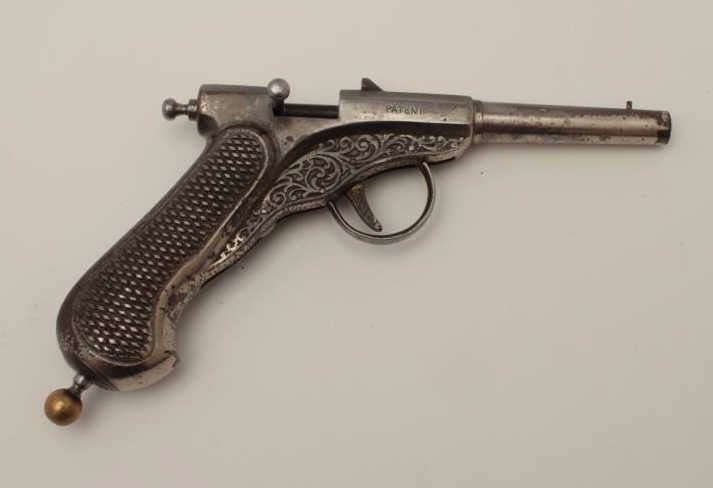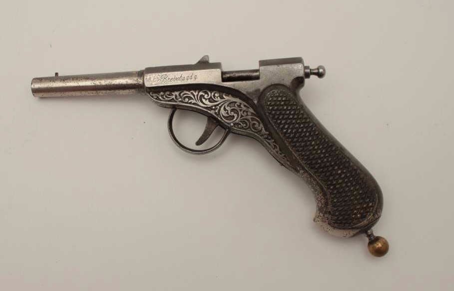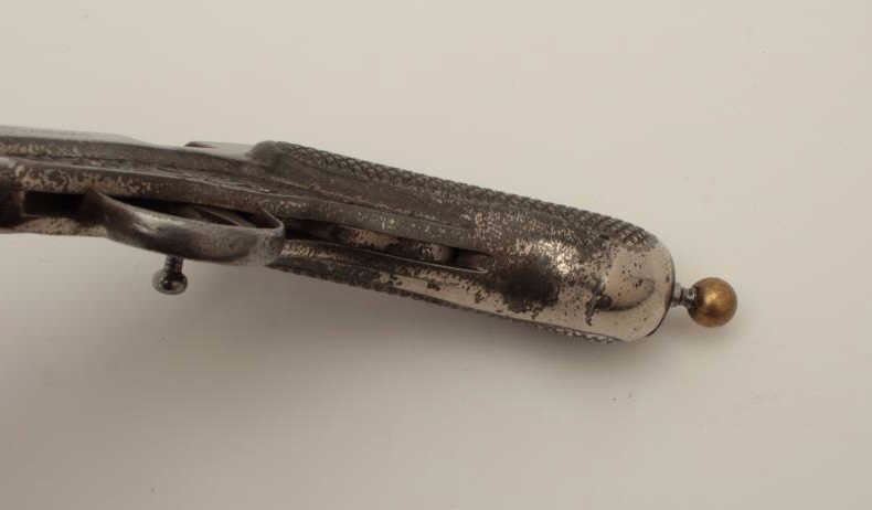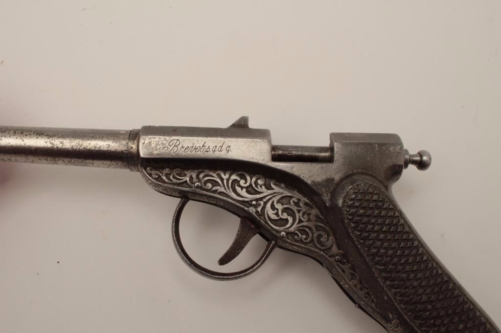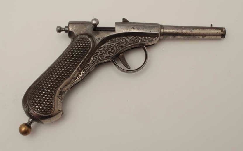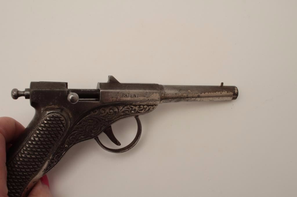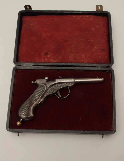 Lot 1478 All cast metal spring gun in case, replaced parts, French 19th Century, approximately 8.5” overall