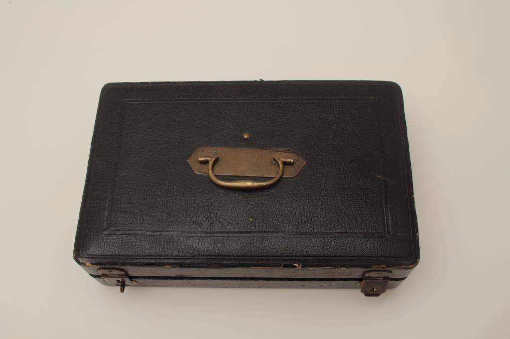 All cast metal spring gun in case, replaced parts, French 19th Century, approximately 8.5” overall. Case is leather covered with brass mountings & carry handle. (Antique). Est.: $300-$600.