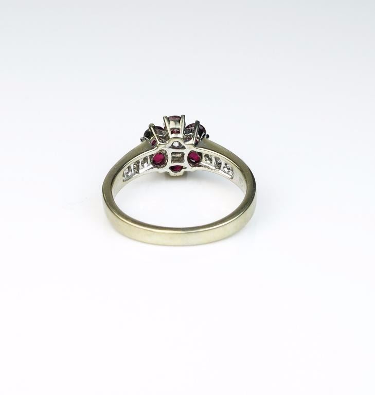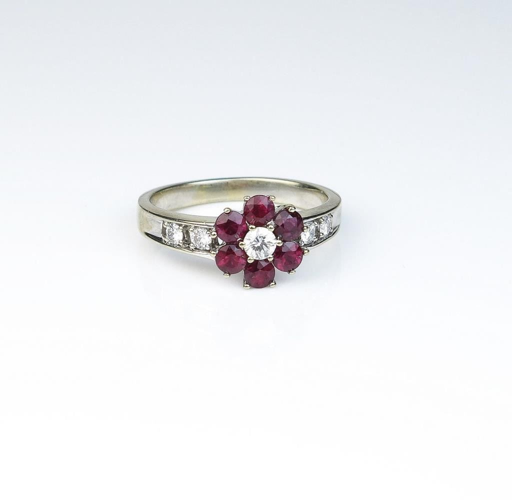 Lot 1481 Charming floral design ring set with six Burmese color rubies and 5 ‘IDEAL’ cut diamonds of F-G co