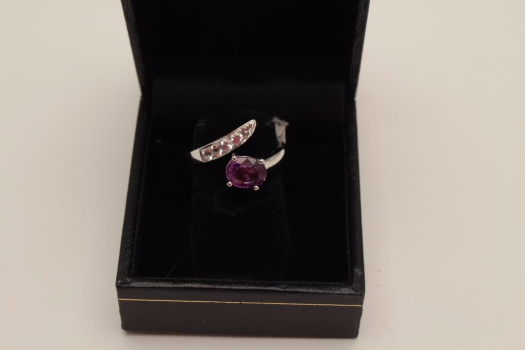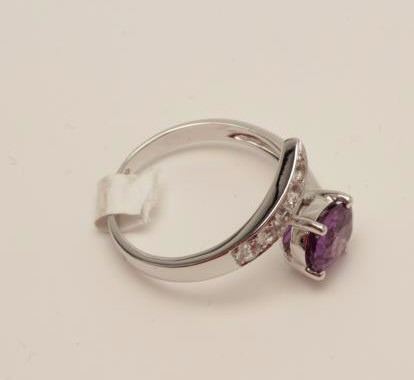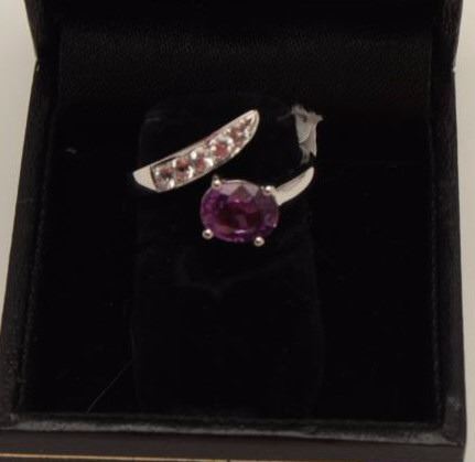 Lot 1484 One unusual oval pink/lavender sapphire ring set in 18k white gold and enhanced with 5diamonds we