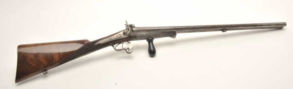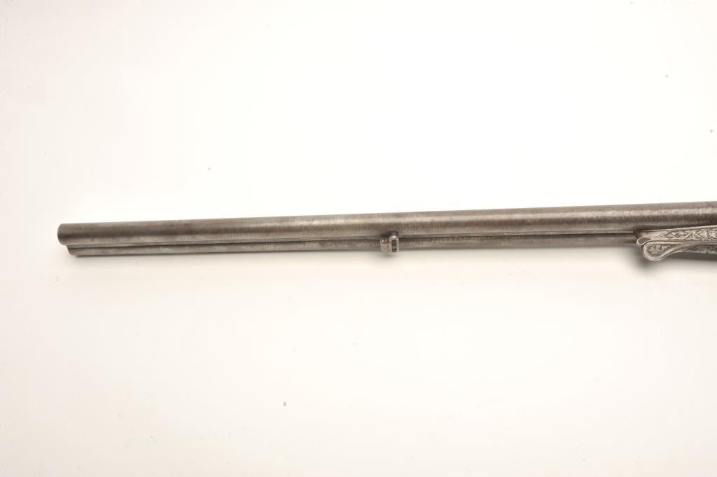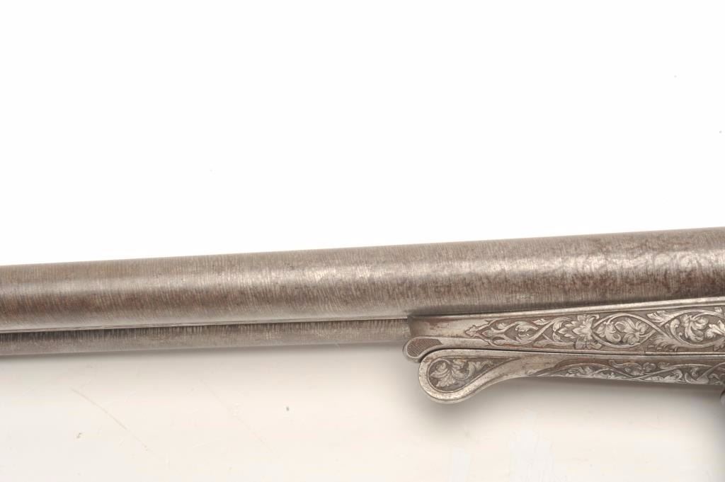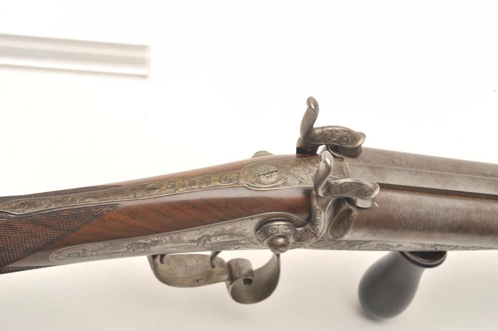 Lot 1495 Excellent double barrel pinfire shotgun, 12 gauge, 26.5” Damascus barrels, finely engraved includi