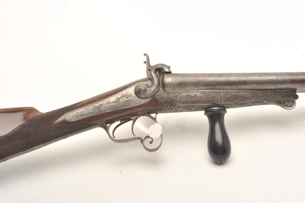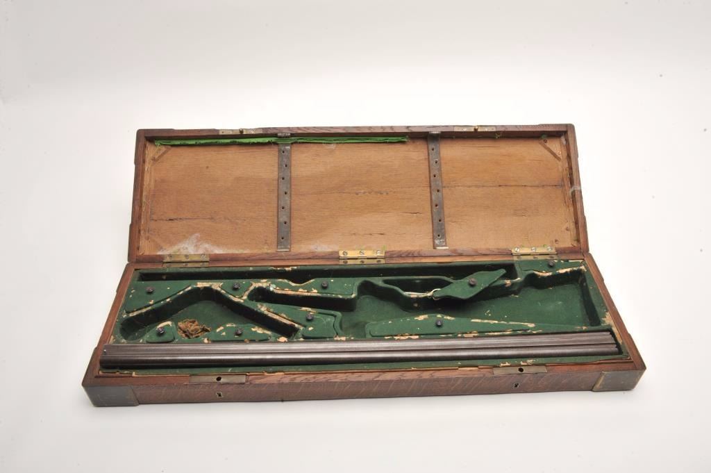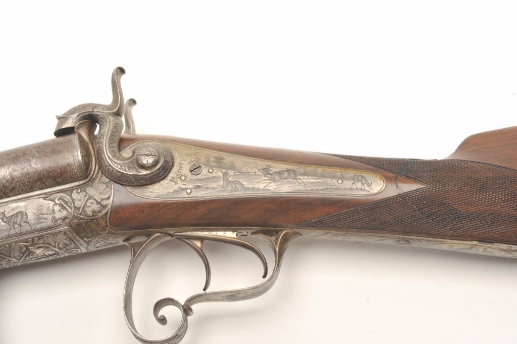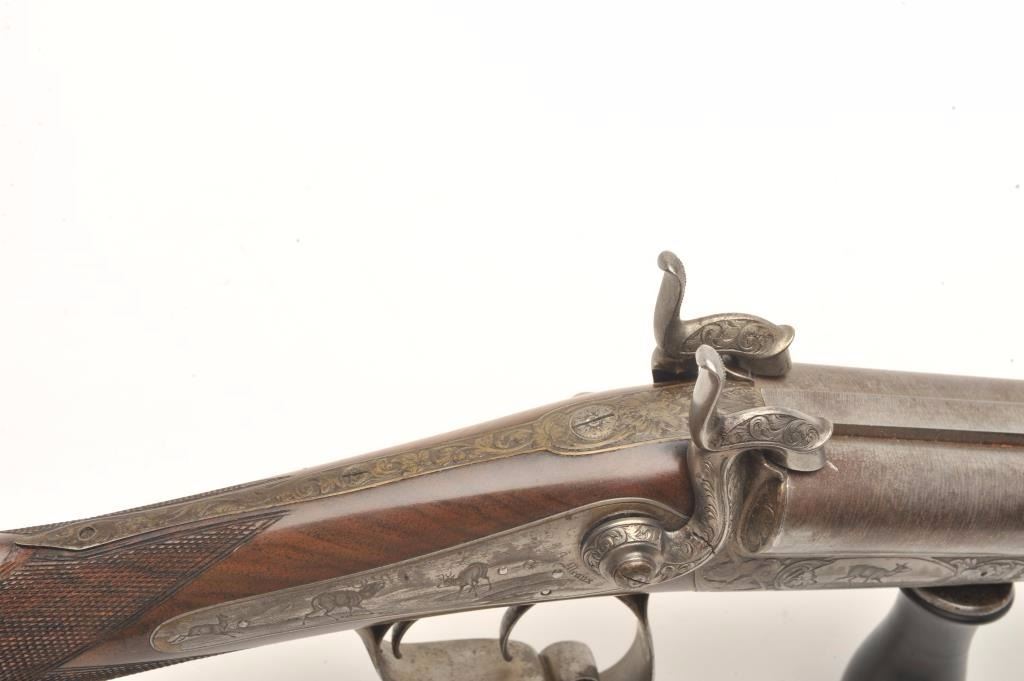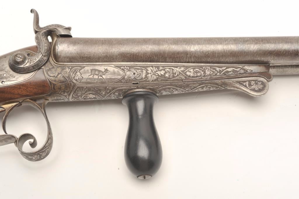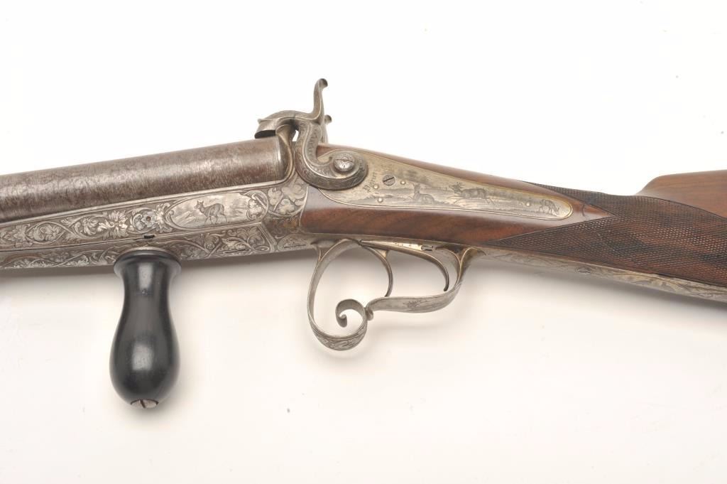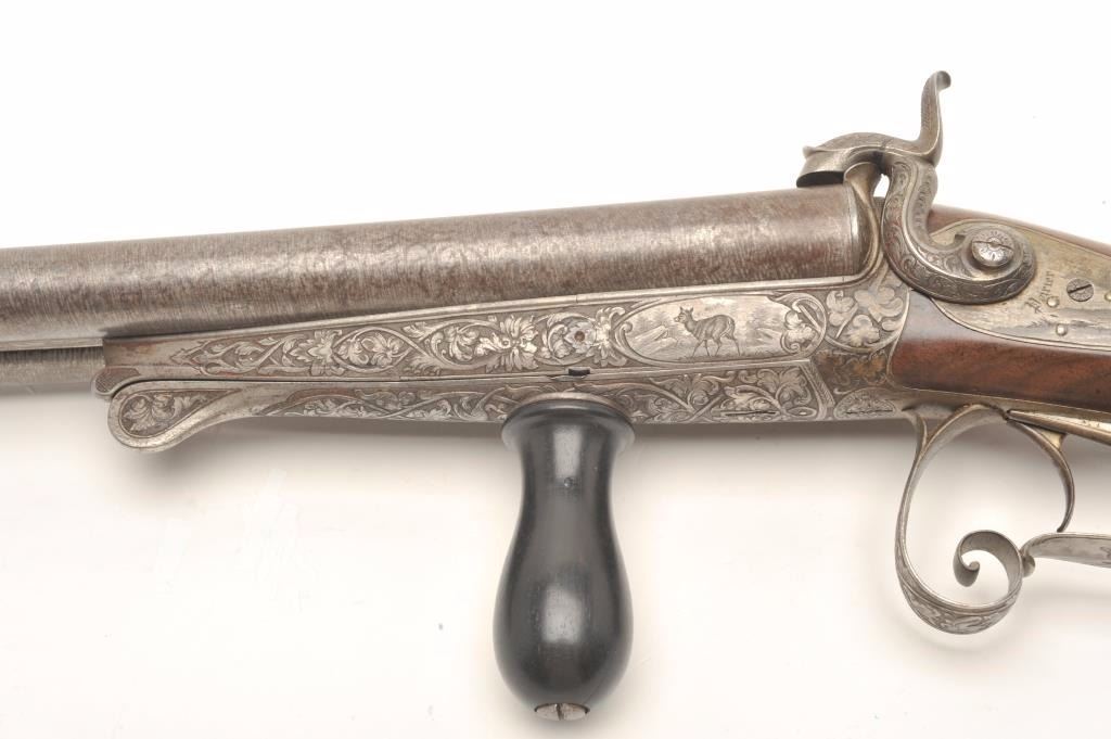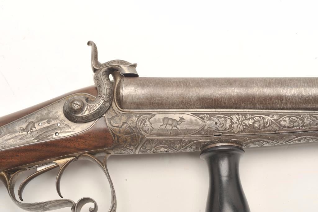 Excellent double barrel pinfire shotgun, 12 gauge, 26.5” Damascus barrels, finely engraved including 6 panel game scenes, accompanied by a second set of 31.5” Damascus barrels marked “Leopold Bernard/Ganonnier AParis” (same marking on other barrel set); back action lockplates are marked “Poirier A Meaux”; checkered deluxe wood butt stock; also accompanied by a wood casing that shows deterioration to areas of lining; brassmounted corners and keys to operate 2 case locks; also a takedown tool is present. This beautiful gun is in overall very good + to near fine condition displaying the majority of its original damascene pattern on bothsets of barrels; the bores are very good to near fine and the actions are crisp and as noted before, the engraving is exceptional; the deluxe wood shows exceptional graining with evidence of an old break to the wrist of the butt stock that has been expertly repaired. Consideration should be given to restoration of the casing for this finely made piece of French firearm artistry. (Antique). Est.: $1,500-$3,000.