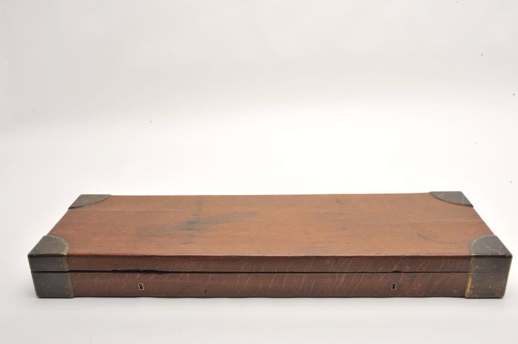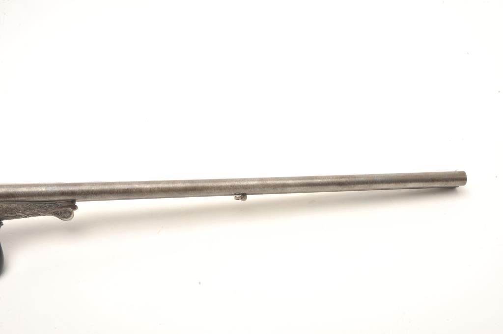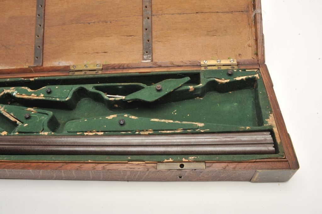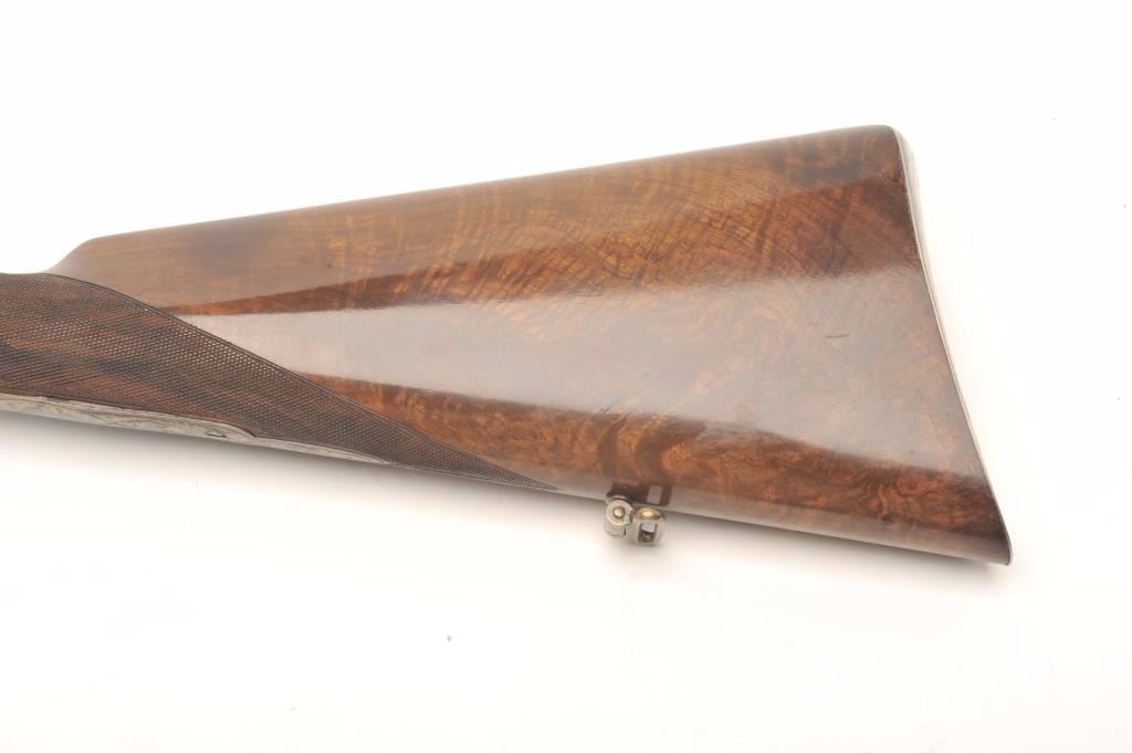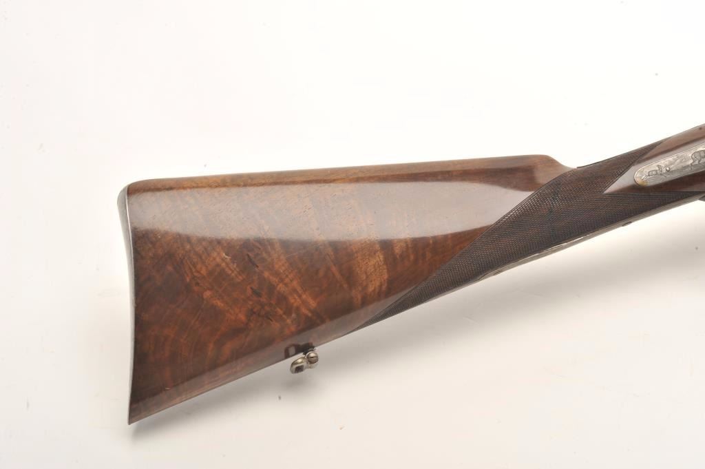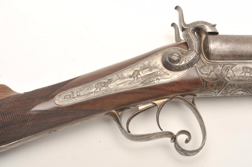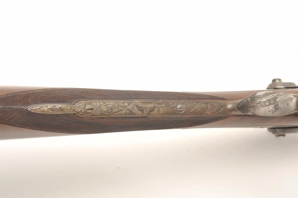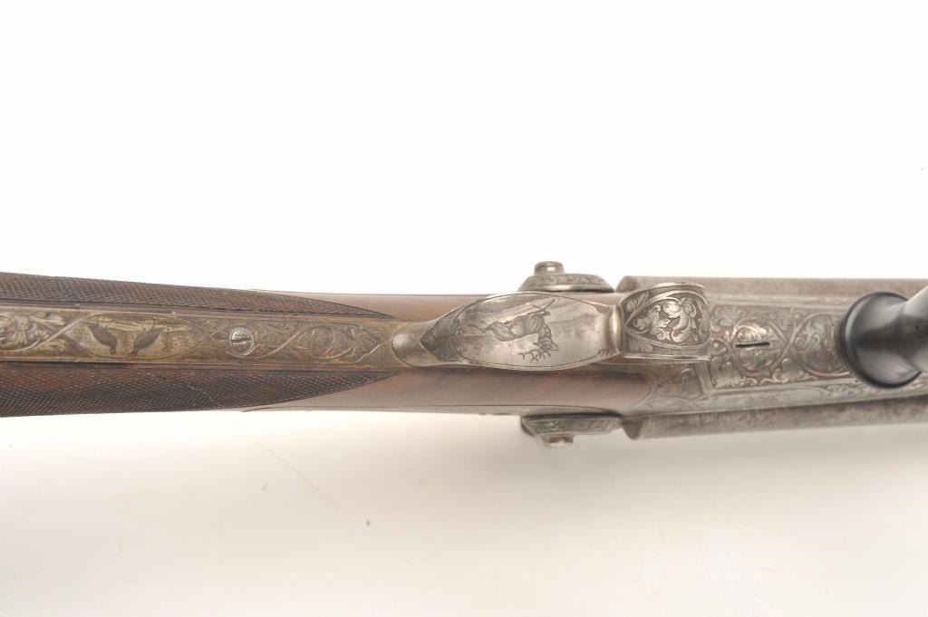 Excellent double barrel pinfire shotgun, 12 gauge, 26.5” Damascus barrels, finely engraved including 6 panel game scenes, accompanied by a second set of 31.5” Damascus barrels marked “Leopold Bernard/Ganonnier AParis” (same marking on other barrel set); back action lockplates are marked “Poirier A Meaux”; checkered deluxe wood butt stock; also accompanied by a wood casing that shows deterioration to areas of lining; brassmounted corners and keys to operate 2 case locks; also a takedown tool is present. This beautiful gun is in overall very good + to near fine condition displaying the majority of its original damascene pattern on bothsets of barrels; the bores are very good to near fine and the actions are crisp and as noted before, the engraving is exceptional; the deluxe wood shows exceptional graining with evidence of an old break to the wrist of the butt stock that has been expertly repaired. Consideration should be given to restoration of the casing for this finely made piece of French firearm artistry. (Antique). Est.: $1,500-$3,000.
