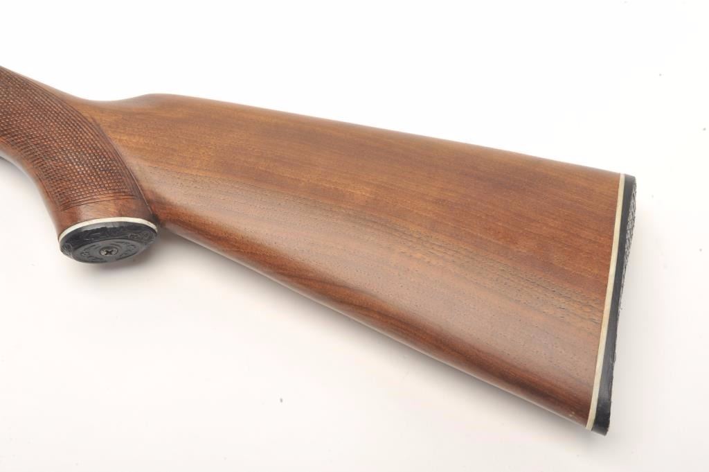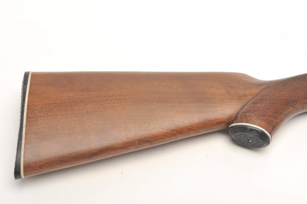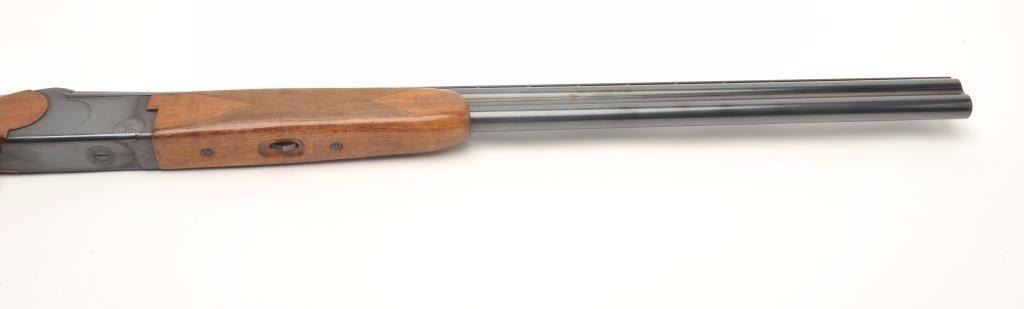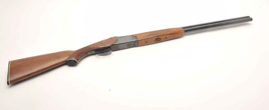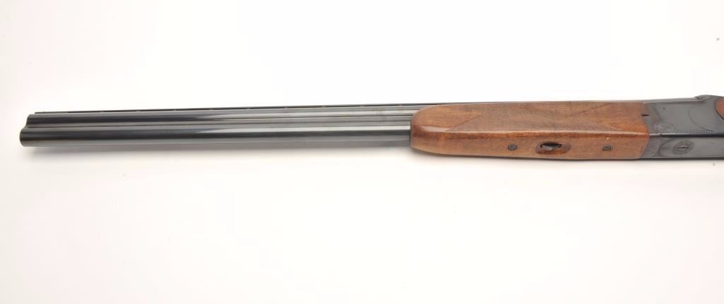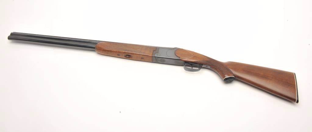 Spanish Astra O/U shotgun, 12 gauge, serial #6642. The shotgun is in very good to nearly fine condition with 28” barrels with a full-length hand filed ventilated rib. The barrels are choked Full and Modified. Thebarrels and receiver retain nearly all of their blued finish with a small spot of light surface rust noted. The receiver is tastefully border engraved and has gold inlayed, “ID” on top of the action. Thebarrels are import marked, “Eidem’s Gun Shop Inc., Anchorage, Alaska”. The checkered wood stocks are in very good condition showing only storage marks. The butt stock ends with a basket weave finished plastic butt plateand 14 ¼” LOP. The bores are very good, the action crisp and markings are sharp on this rarely encountered O/U by Astra. (Modern) Est.: $500-$1,000.