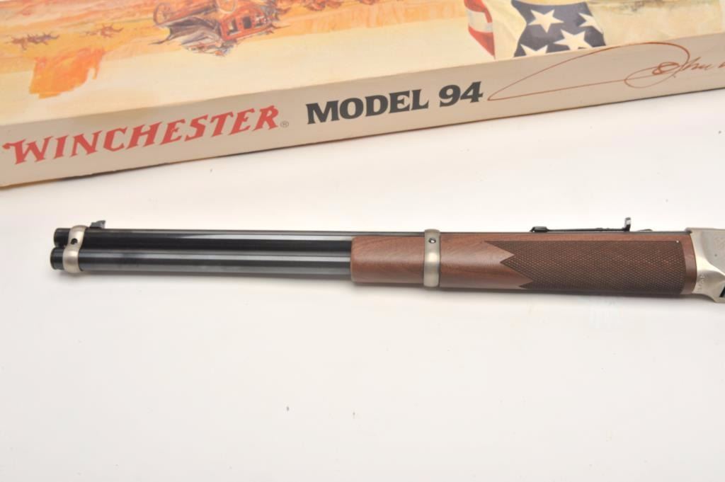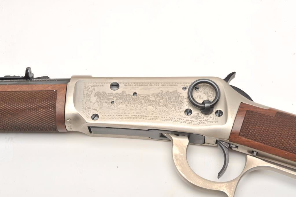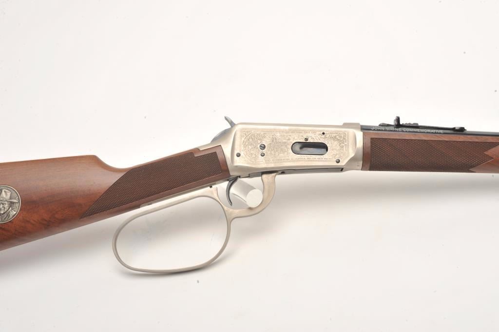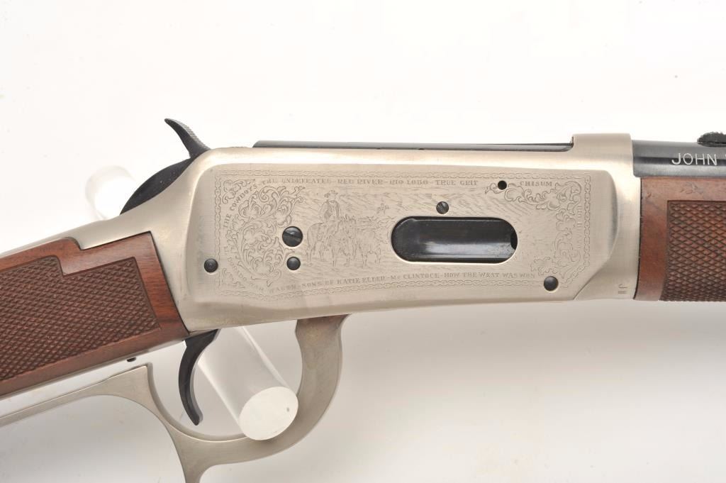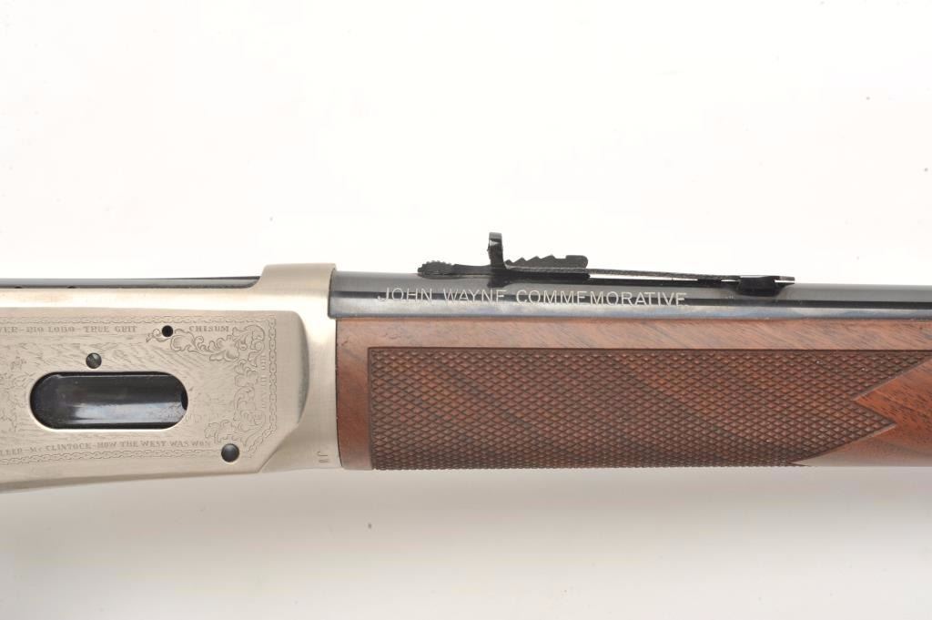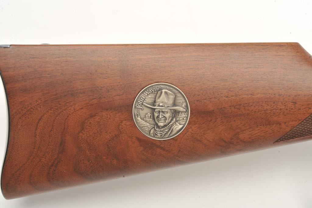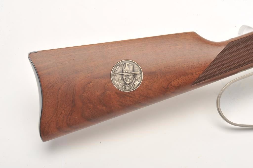 Desirable John Wayne Commemorative Model 94 lever action SRC, .32-40 Win. caliber, 18.5” barrel, blued barrel assembly, receiver decorated with scenes of stagecoach and cattle drive along with names of Waynemovies, checkered wood stocks with John Wayne commemorative coin inlaid in right side of butt stock, S/N JW 25435, with factory cardboard sleeve, Styrofoam inserts, instructions, empty John Wayne Commemorativebox for .32-40 cartridges and end label of gun box numbered to this gun; gun is in overall like new condition. (Modern). Est.: $1,000-$2,000.