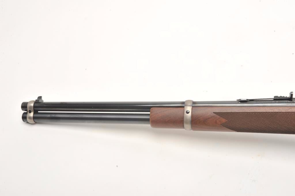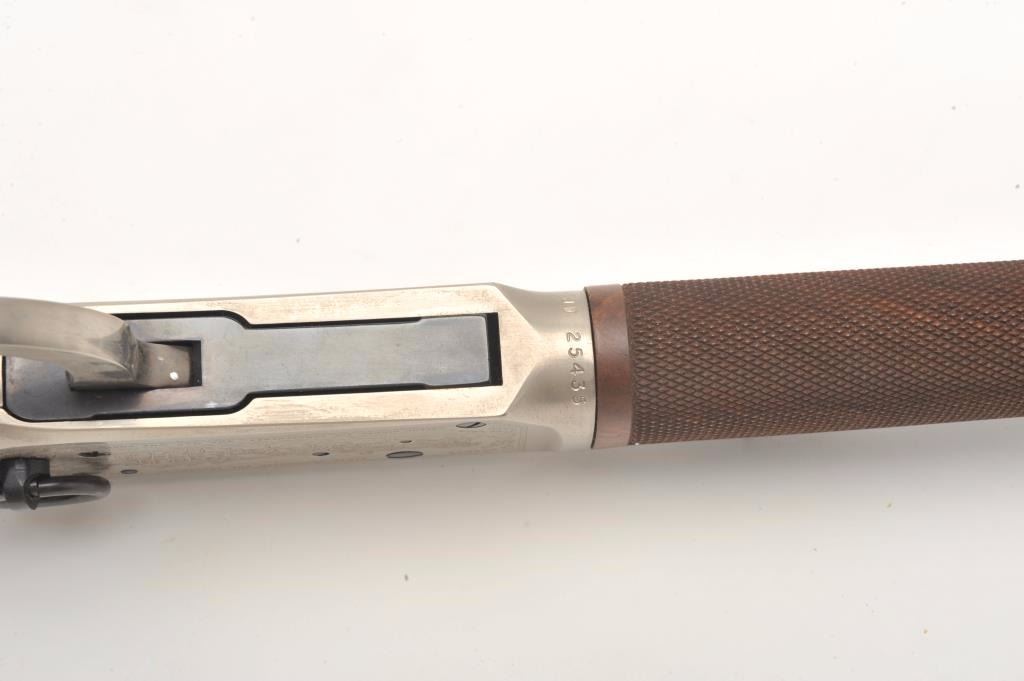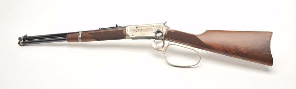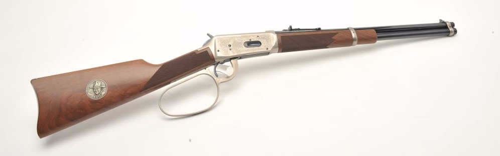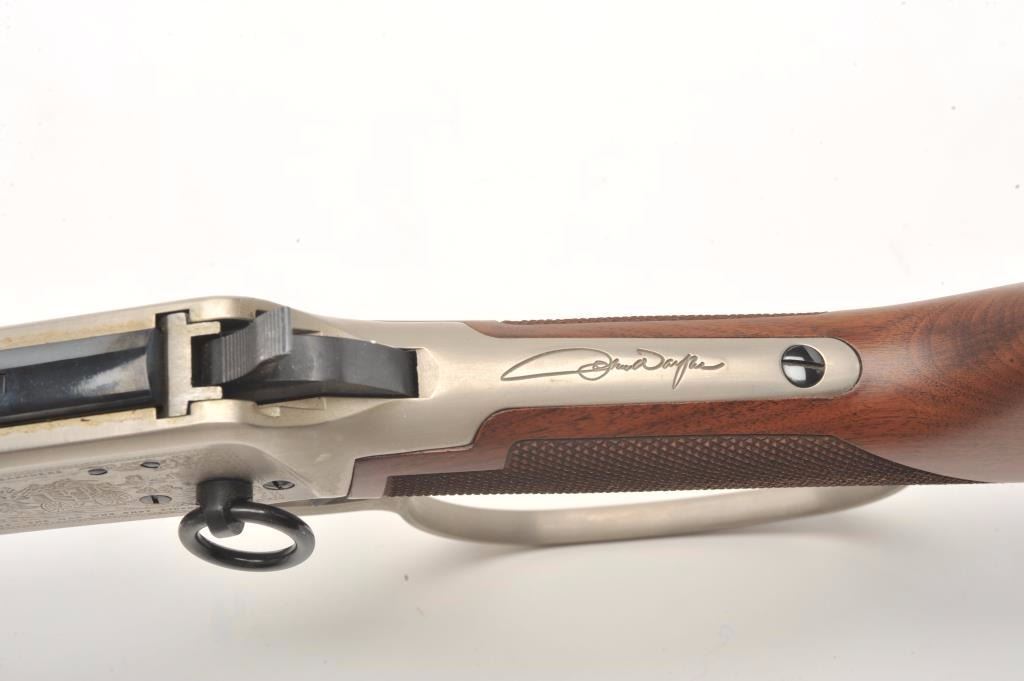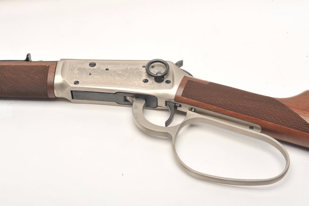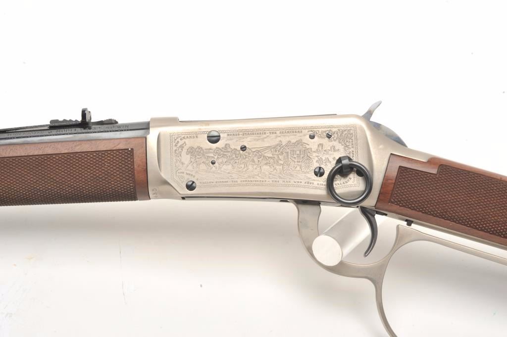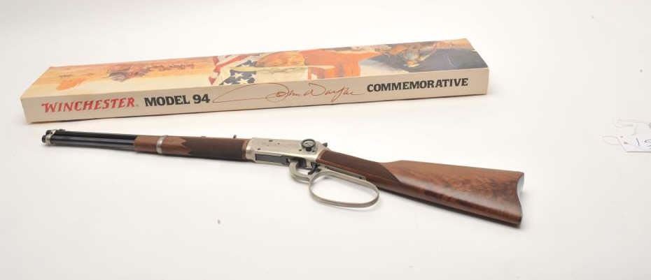 Desirable John Wayne Commemorative Model 94 lever action SRC, .32-40 Win. caliber, 18.5” barrel, blued barrel assembly, receiver decorated with scenes of stagecoach and cattle drive along with names of Waynemovies, checkered wood stocks with John Wayne commemorative coin inlaid in right side of butt stock, S/N JW 25435, with factory cardboard sleeve, Styrofoam inserts, instructions, empty John Wayne Commemorativebox for .32-40 cartridges and end label of gun box numbered to this gun; gun is in overall like new condition. (Modern). Est.: $1,000-$2,000.