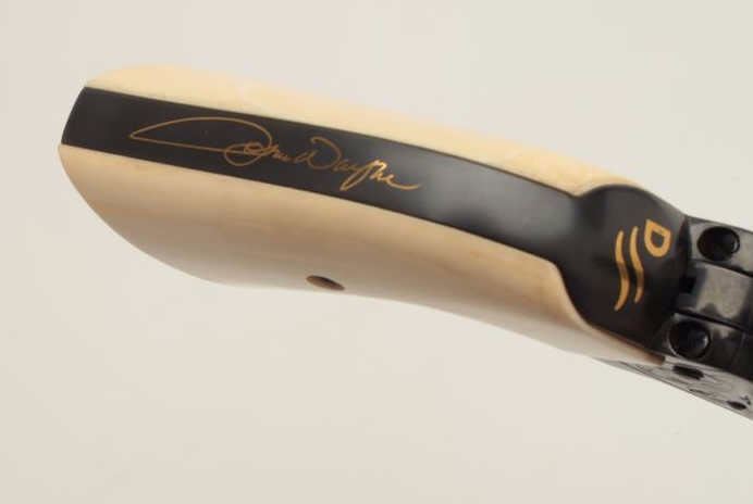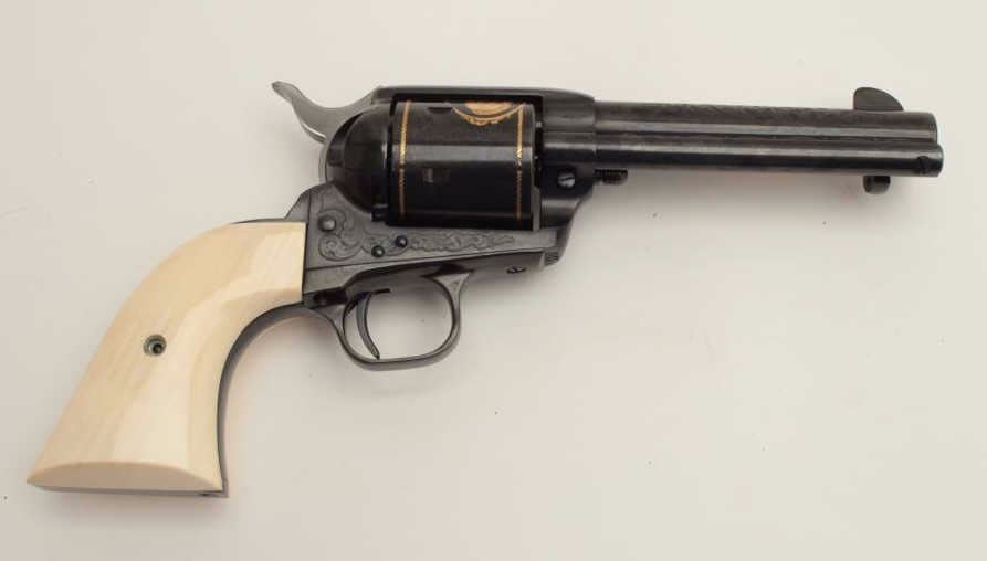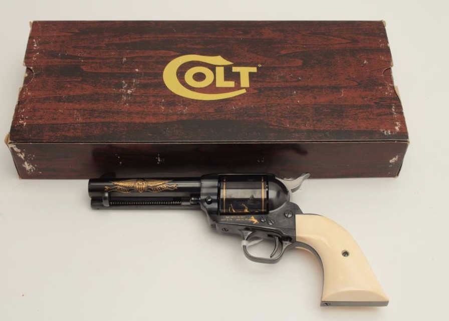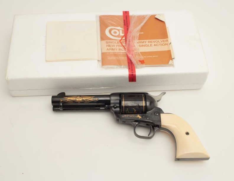 Desirable John Wayne Commemorative SAA revolver, .45 caliber, 4.75” barrel, blued with gold decoration and engraving to frame and barrel, ivory grips, S/N CJWC/2796X, with wood grained Colt cardboard box andinstructions, in like new condition showing little handling. (Modern/PPT). Est.: $1,250-$2,500.