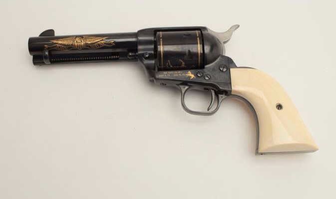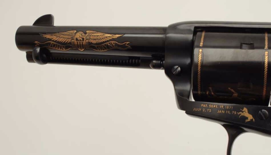Lot 1501 Desirable John Wayne Commemorative SAA revolver, .45 caliber, 4.75” barrel, blued with gold decora